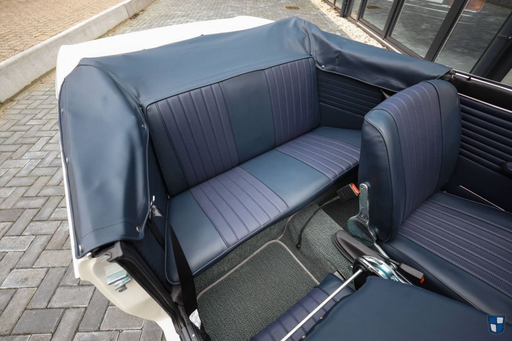 The interior shows the correct Convertible seats. Everything has been reupholstered in beautiful marine blue vinyl. It features a new set of carpets in the correct loop-style material. The dashboard is the correct 3-piece dashboard with Convertible-specific lock. The chrome under the dash has all been replaced and even the ashtray was restored. The doorpanels are brand new, so as the doorgaskets.
