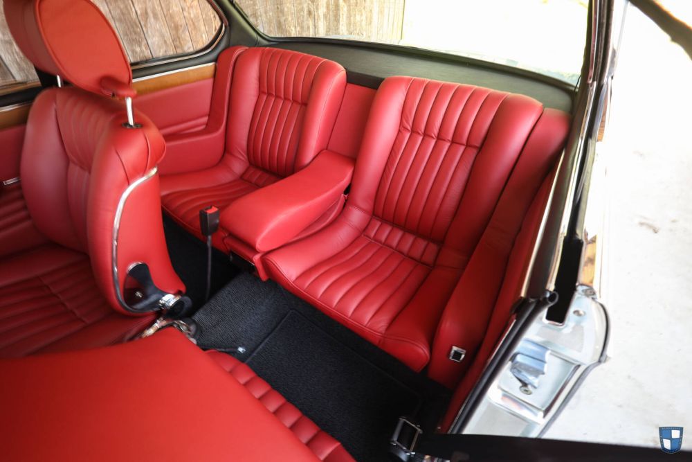 The same goes for the inside. The seats and rear seat have been reupholstered beautifully in red leather as well as the doorpanels. The dashboard is actually still original and very nice, so is the wood on the dashboard and doorpanels. The inside of the car was painted as well and on top are insulation mats and new set of carpetting. It features a beautiful Becker Custom Kurier in original center console and a beautiful Petri steering wheel, which was a factory option.