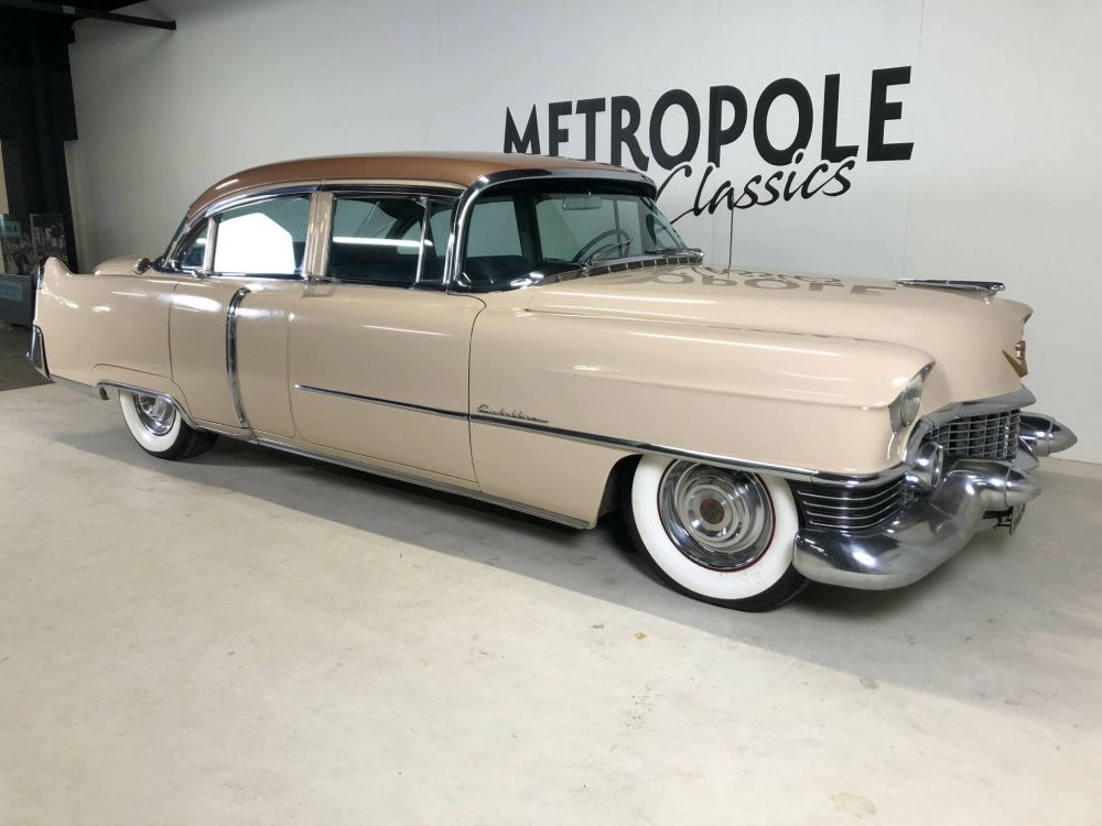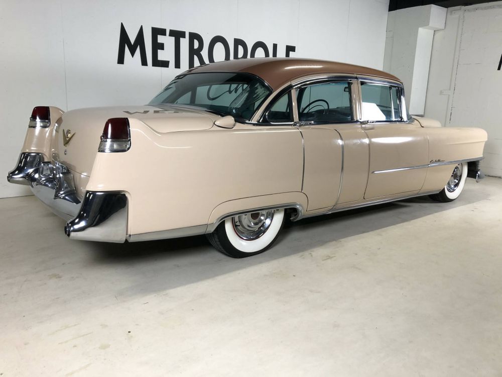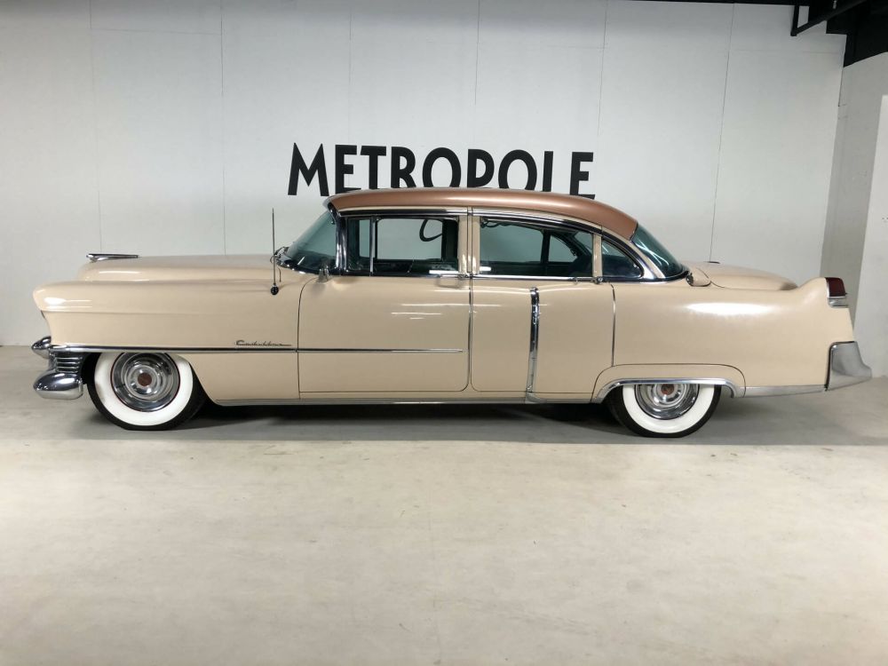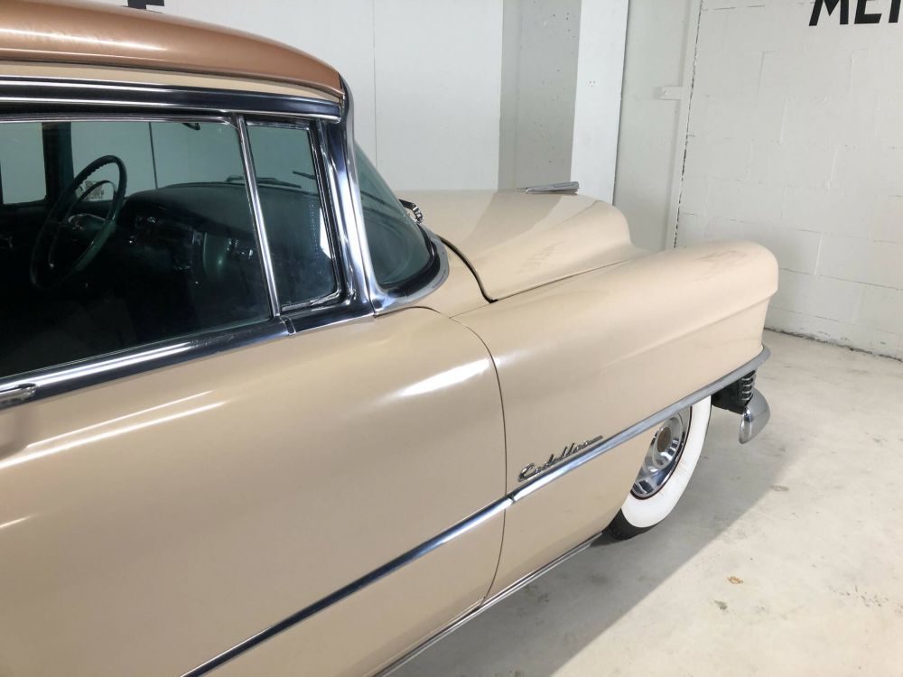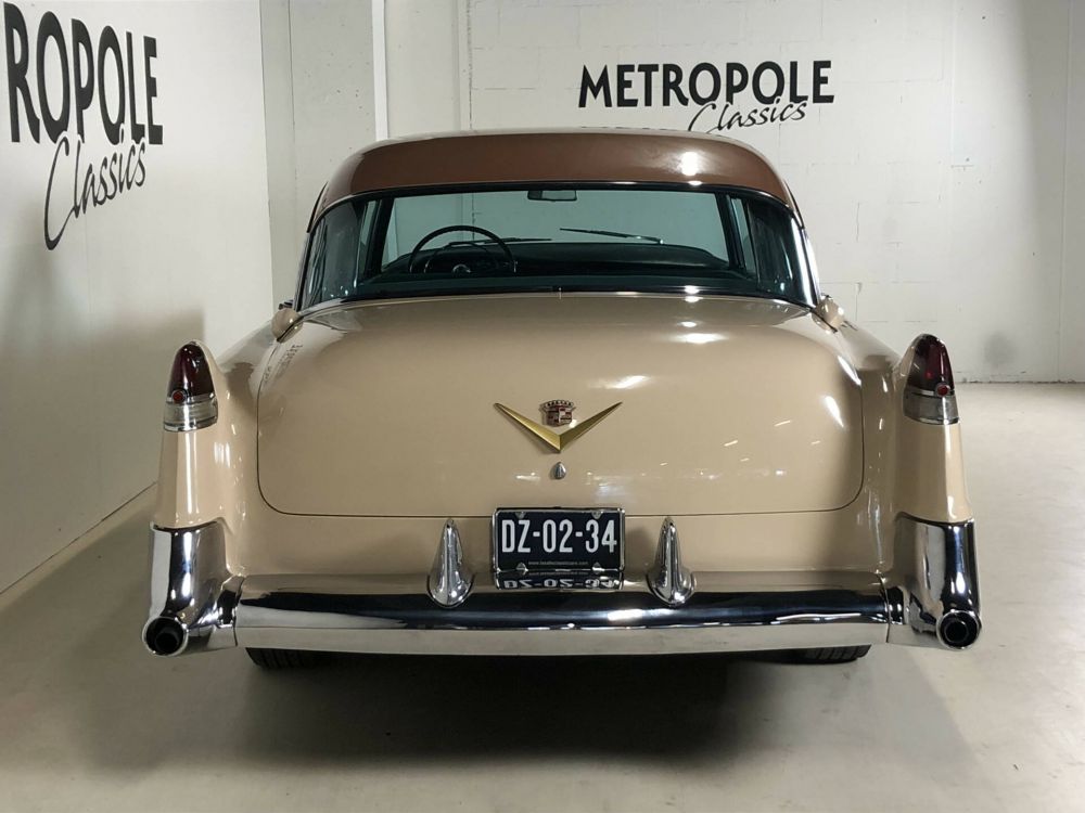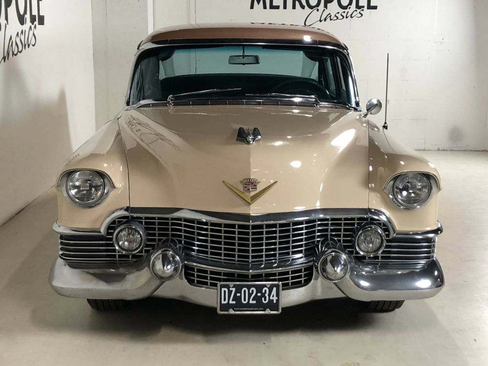 1954 Cadillac Sedan in a beautiful and very original condition! This Cadillac was delivered new on February 19, 1954 to a Dr. Bupfeldt from Miami Beach, the original owner tag is present. The bodywork is very sleek and neat. Completely rust and damage-free chassis. Beautiful paintwork in the original two-tone colors Driftwood/Copper metallic (paint code Z14). The light and dark green fabric interior (trim 57) is in fantastic and original condition. The chrome is beautiful and original, the frames are dent and scratch-free. Equipped with the 'numbers matching' 331 cubic inch V-8 engine with 230 hp, dual exhaust system, 4-speed Hydra-Matic, power brakes, power steering, fog lights, signal seeking radio, EZ-Eye tinted glass, air conditioner with roof ducts and 5 new white wall tires. Many new parts, including: 4 shock absorbers, new springs, completely new braking system with front disc brakes, double circuit and stainless steel pipes. The entire forecourt has also been renovated and an electric windshield wiper conversion kit installed. Major service recently carried out during which all fluids and filters were replaced. Dutch license plate.