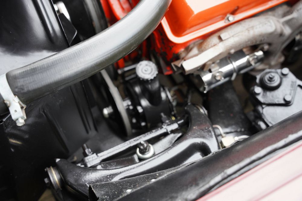 Year of construction 1965 means that the necessary improvements have been made to the car. For example, disc brakes were mounted for the first time in that year. Ventilated and equipped with four brake suckers per claw. Anything but obvious at that time! The wheels are of the type with the central wing nut, the so-called knock-off wheels.
