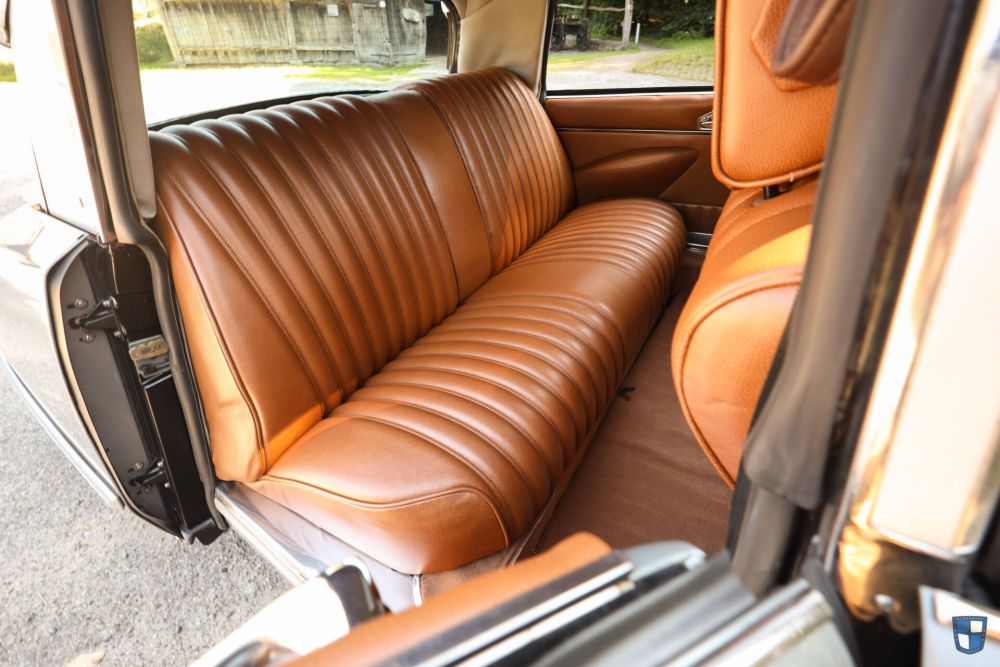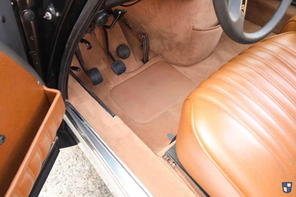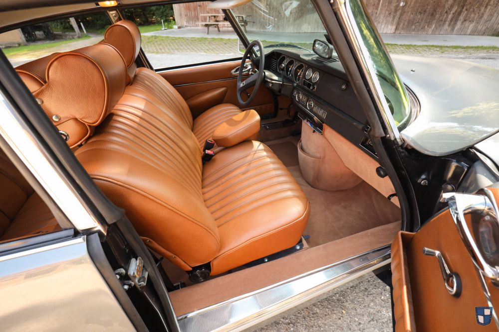Also the interior has been restored completely. Redone leather seats and rear seat in the correct 'Fauve' (Tan) color. A beautiful rich color and nice supple leather. The Pallas doorpanels have been done in the same material. The interior really feels and smells new because the carpets and the headliner have been replaced as well. It has a restored steering wheel and new automatic seatbelts for truly restored feel. It has modern, hidden speakers and a modern radio in the glovebox for decent sound.