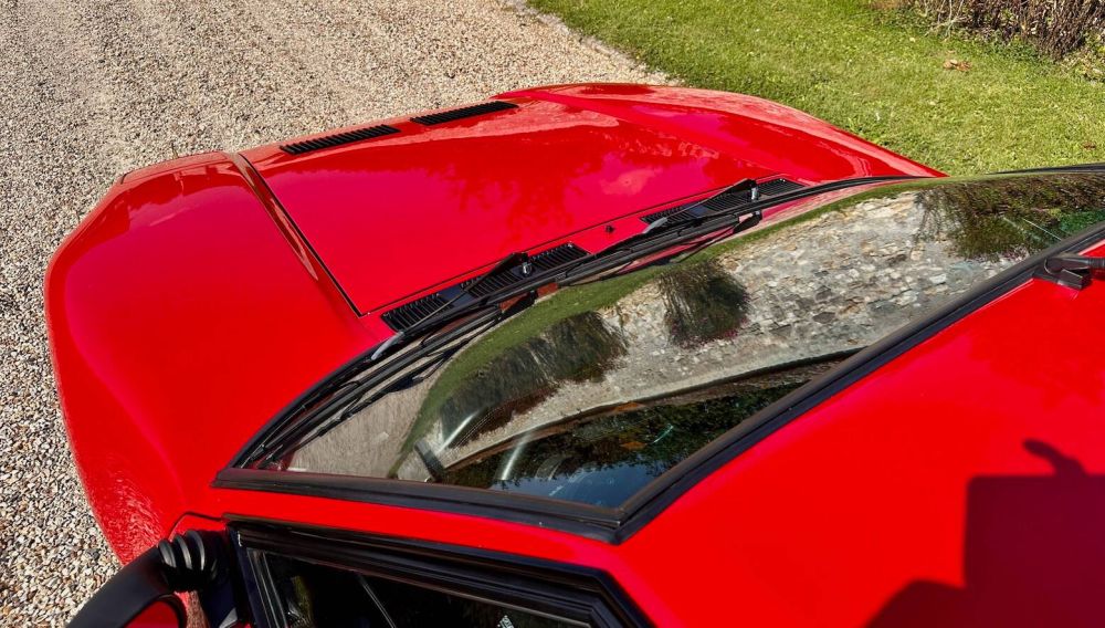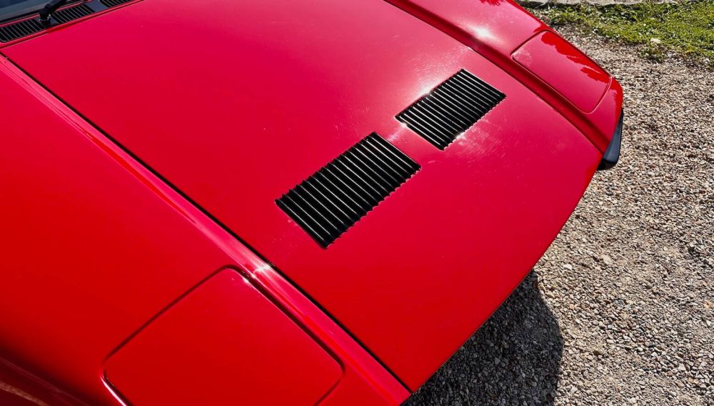 Nous faisons connaissance de cette voiture en 2021 avec son propriétaire français actuel qui l’a achetée en Allemagne. La voiture a été repeinte en rouge avec la décoration exacte du catalogue de l’époque et sans l’aileron, ce qui est beaucoup plus jolie. La voiture est complètement conforme à l’origine.