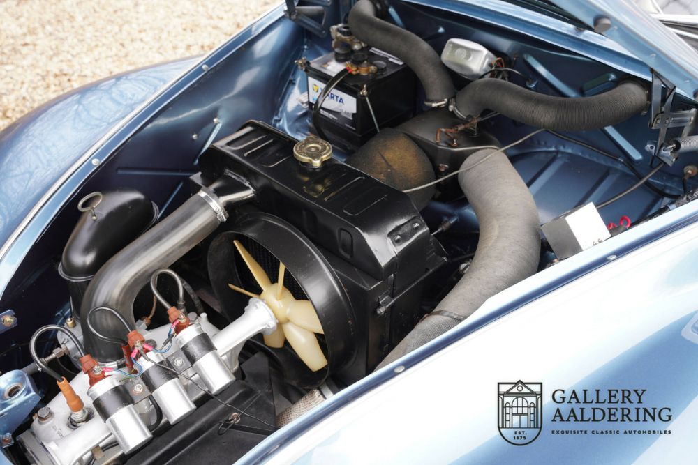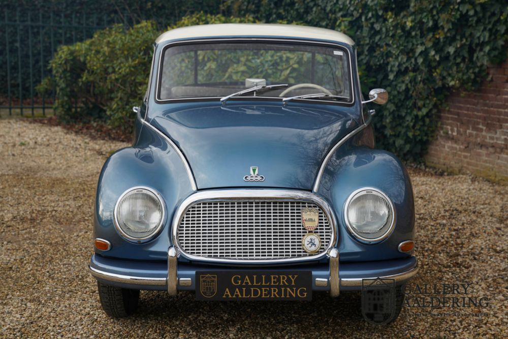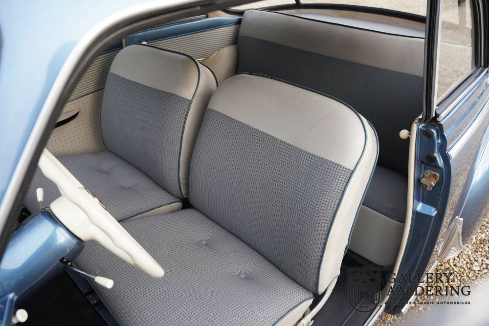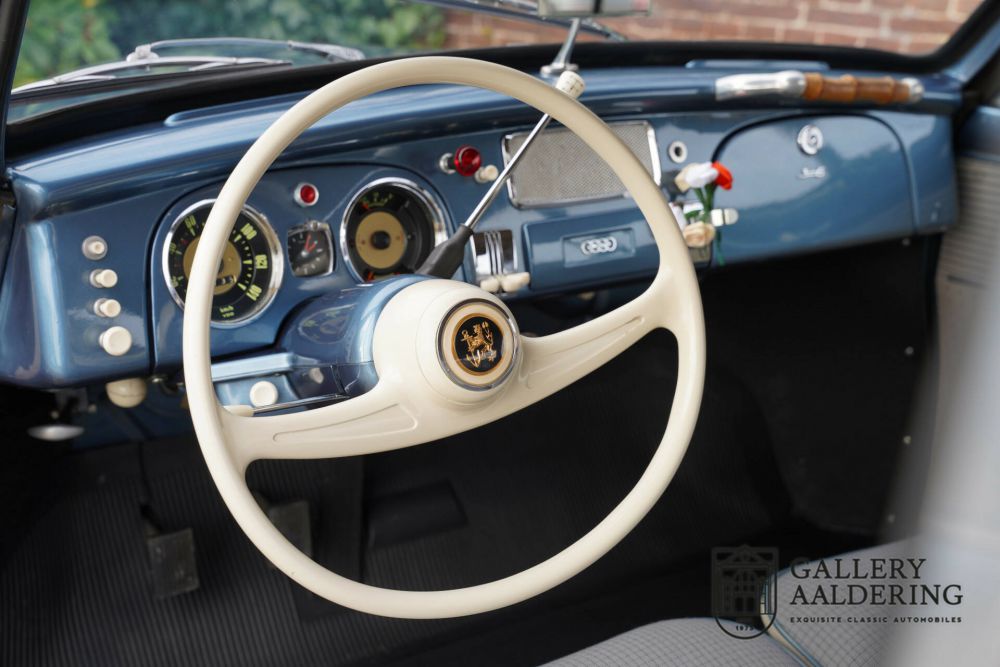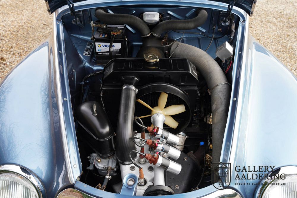 Our model dates from 1958 and is presented in a well-maintained good condition, having been a restored and overhauled. The paintwork has a deep lustre, and the two-tone combination of the blue bodywork and a white roof looks a treat. The brightwork and rubber parts are neat, as are the windows and the rims.