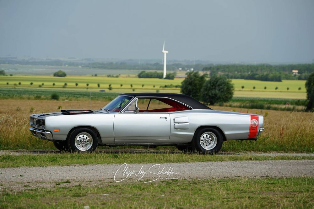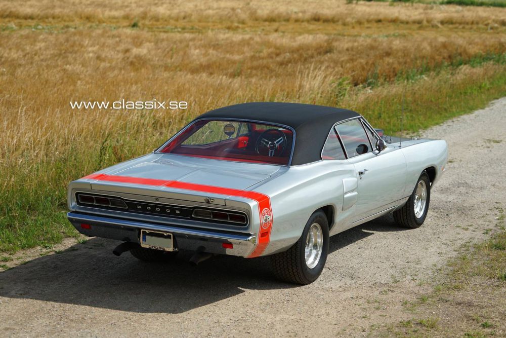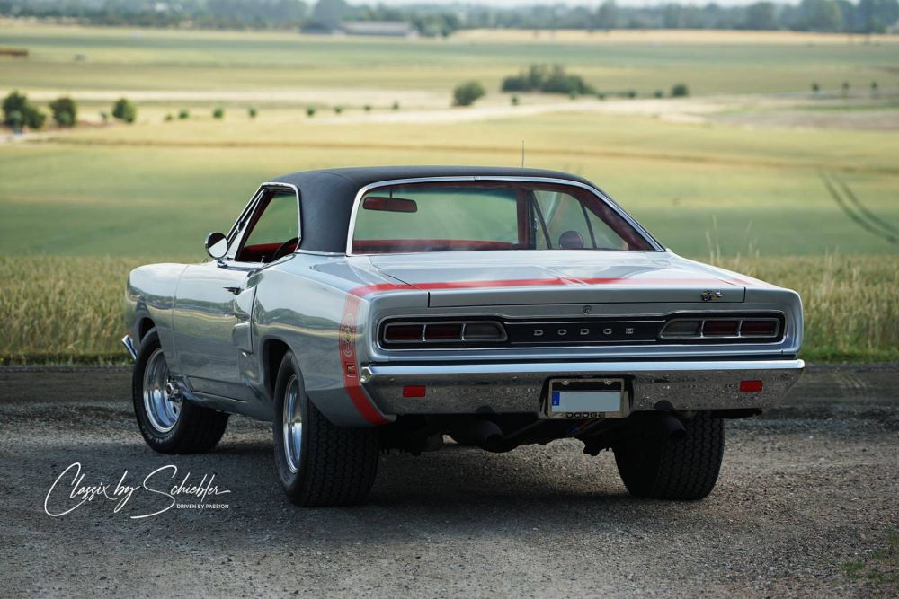Exterior: The Dodge Coronet Super Bee 440 “Six pack” 1969 that we have for sale I think is as muscular as an American muscle car can get. Today fitted with a set of wheels that suit the style of car and fill out the wheel arches well. The colour combination is just spot on for this giant 2-door coupe. A lot of work has been done recently to the body. The Super Bee was repainted in 2018/2019 and has been used only on dry summer days after that. At the same times as the car was painted, the vinyl top was also replaced. The Super Bee is now straight as arrow and has very good panel gaps. The underneath of the car is as good as the top. New European headlights replaced the sealed beam type used in USA during this period.
