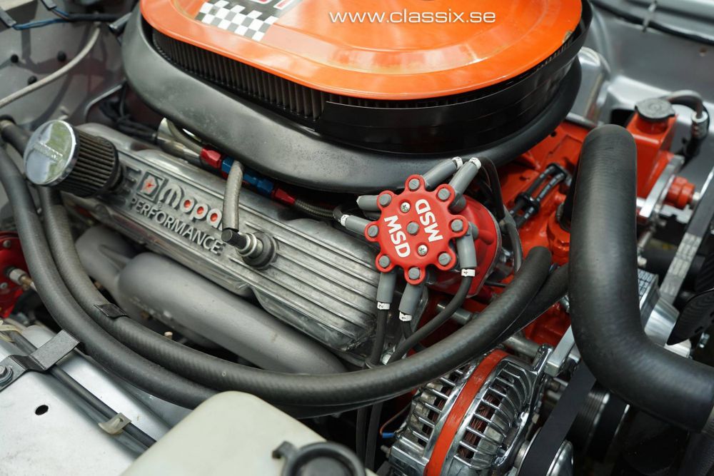Professionally balanced 440cu in Six Pack V8 Bored 0.30 over 906 Cast iron heads, ported and loaded with Ferrea valves Edelbrook intake Holley carburettors 10:8:1 Compression ratio Keith black pistons- Hyper utekit pistons MSD ignition and distributor Adjustable rocker arms Aluminium water pump and house Aluminium radiator Transmission: TorqFlite Automatic 727 3 speed Turbo action 10 inch 3.500 Stall torque converter Hurst pistol grip “quarter stick” Moses axles MP super stock springs Disc brakes front 3-inch aluminum exhaust, with Magnaflow mufflers 1 7/8 Ceramic coated hooker heads