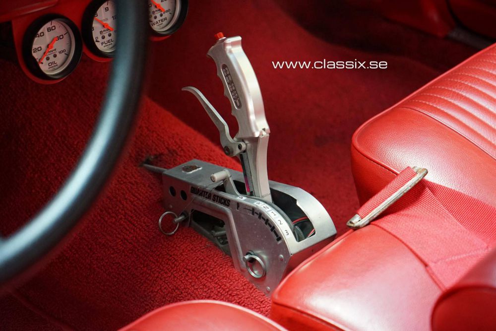 Interior: The bright red interior matches the Super Bee decor on the outside of the car. A few extra gauges have been added to make sure you have everything under the big black hood under control. There are proper seat belts installed up front for your safety. Otherwise, the only thing that reveals that this is something more that ordinary on the inside is the big Hurst shifter grip.