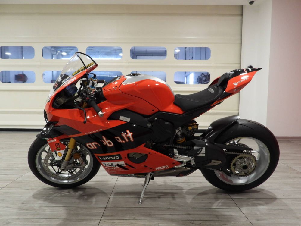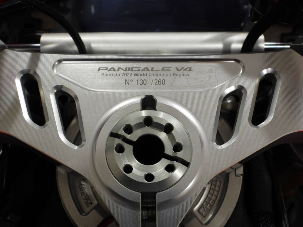 Testa di sterzo in alluminio ricavato dal pieno con nome e numero progressivo della moto, Serbatoio carburante in alluminio spazzonato (solo livrea racing Bautista#19), Serbatoio autografato in originale da Alvaro Bautista (#19), Plexiglas da gara, Silenziatore omologato Akrapovič, Paracalore in fibra di carbonio per collettori di scarico posteriori, Frizione a secco 9 dischi STM-EVO SBK, Pedane pilota regolabili Rizoma in alluminio ricavate dal pieno con paratacchi in fibra di carbonio, Pinze Brembo Stylema R Pompa Brembo MCS con remote adjuster, Leve freno e frizione lavorate, Parafango anteriore e posteriore in fibra di carbonio, Condotti d’aria per il raffreddamento dei freni anteriori in fibra di carbonio, Cover forcellone in fibra di carbonio e titanio, Cover alternatore in fibra di carbonio