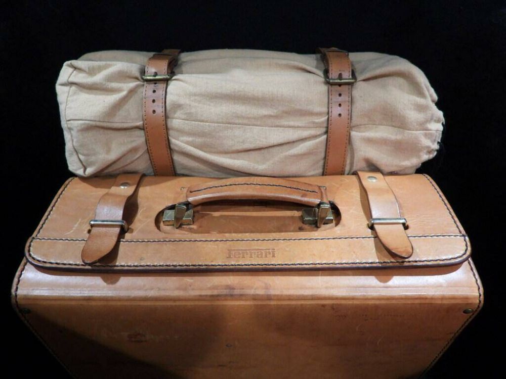 ORIGINAL BAG WITH TIRE REPAIR KIT AND BROWN LEATHER TOOL KIT COMPLETE WITH FERRARI BRANDED TOOLS