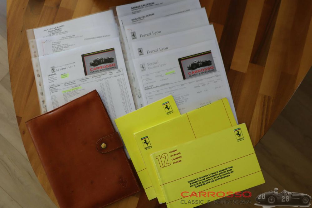 This example was delivered new on 1 October 1990 by Ferrari dealer Pozzi Charles in Paris, France. The original sticker from this dealer is still present on the rear window. The warranty and service booklet is still present and fully completed. Numerous maintenance invoices are also present. Other official dealers who have stamped the booklet are Cavallari in Monaco and Gauduel Sport in Lyon, where the last owner had the car serviced from 2006. We were able to acquire the Ferrari from this last owner in Lyon. What stands out is the beautiful finish in black paintwork and a black interior. Underneath the car are original 16-inch rims with newly fitted Michelin Pilot Sport tyres. The Ferrari tool kit is still present, as is the original service and instruction booklet and leather folder. The interior and engine compartment also show how carefully the car has been handled. The interior is damage-free and the engine compartment is dry. It is equipped with an alarm system. The seams of the car fit together nicely.