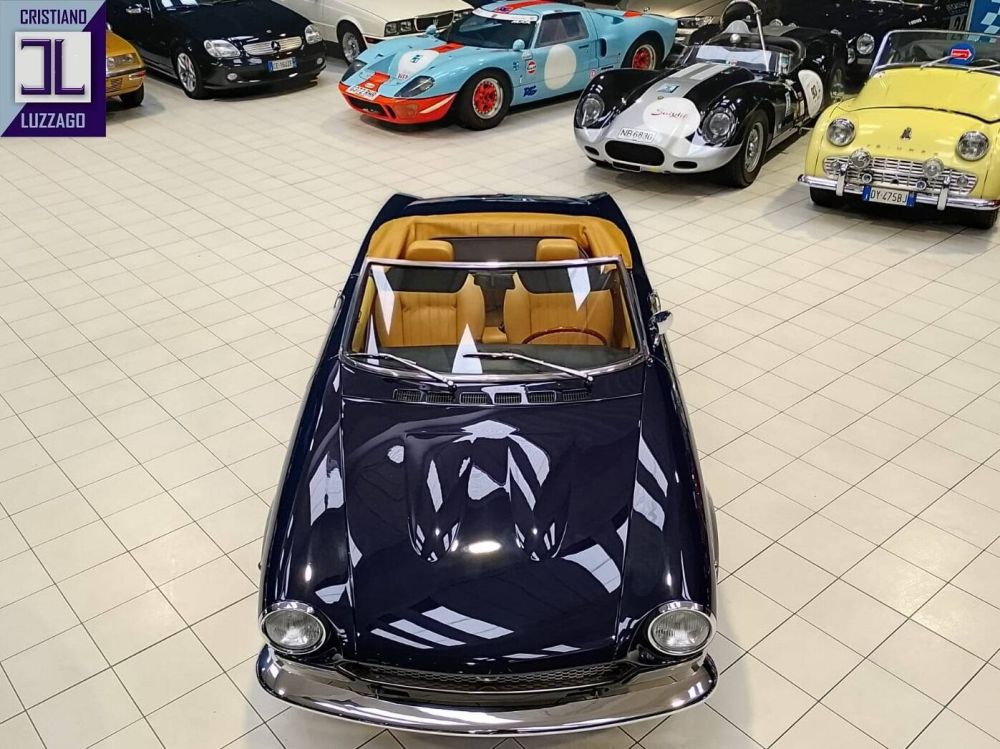 Un restauro meticoloso ha riguardato sia la carrozzeria che le tappezzerie: la scocca è stata riportata al metallo nudo per poi essere riverniciata nel suggestivo blue d’origine, mentre le tappezzerie sono state realizzate con materiali originali, esaltando l’autenticità dell’auto.