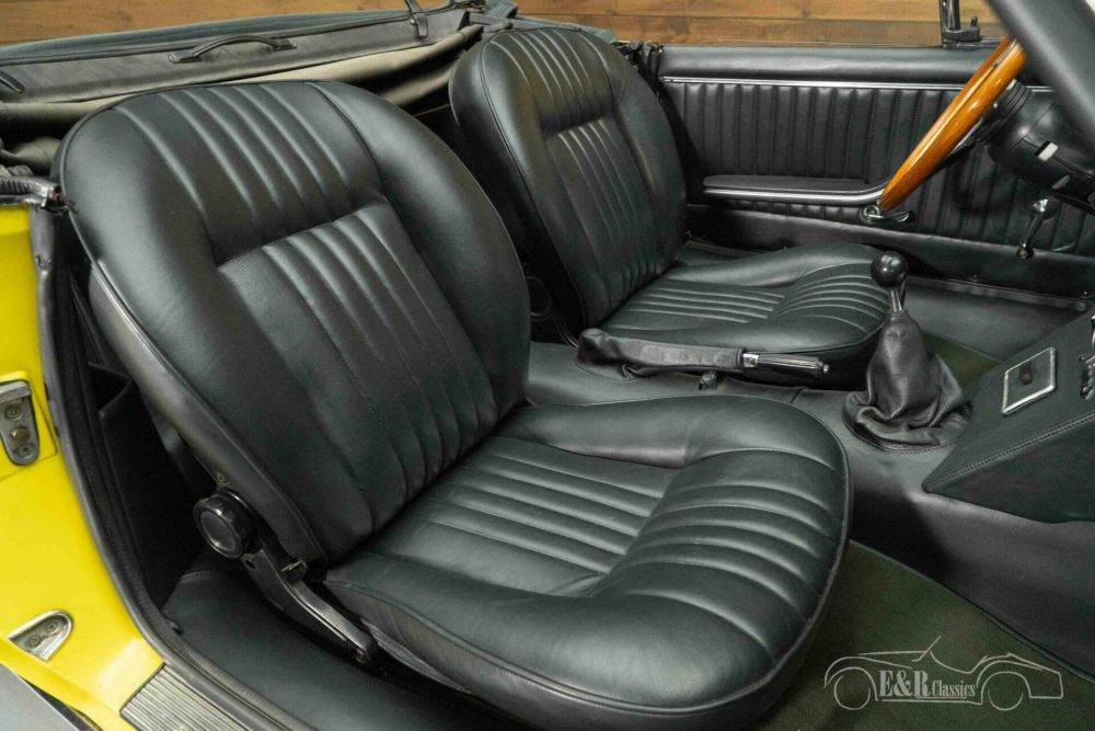The exterior is finished in striking yellow paintwork, which contrasts beautifully with the dark green leather upholstery and the black soft top. The bodywork, designed and built by Pininfarina, exudes elegance and sportiness from every angle. The classic wheels with original hubcaps reinforce the timeless character. Inside, the Italian design feeling continues: the wooden steering wheel, the black gauges and the leather interior form a perfect whole with the sunny exterior. Everything exudes authenticity and style — this is a car that can be seen and drives fantastically.