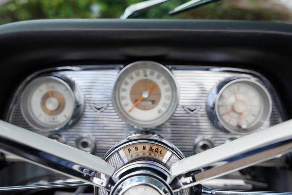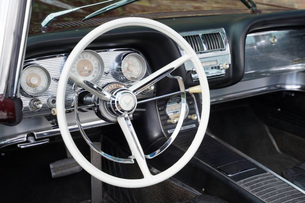 Inside, we encounter very nice authentic upholstery. The leather shows signs of use, but still looks beautiful. We love this period of American cars, and the entire interior exudes an early 1960s aura. The dashboard, together with the controls, are in great condition. Sturdily built, as we are accustomed to from Ford, and beautifully designed.