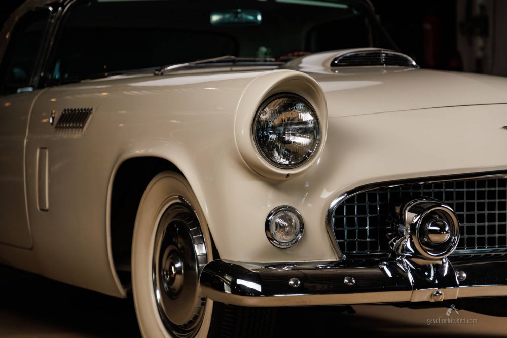 Weg von der Biologiestunde, zurück zu den harten Fakten und ebenso harten Stossstangen der 50er Jahre. Der Thunderbird war die amtliche Antwort von Ford auf die erste Generation der Corvette. Und es war eine ziemlich gute Antwort, hatte GM bei der Vette einen eher müden Sechszylinder mit angemalten Ventildeckeln aus einem Truck für das Mass der Dinge erklärt, hatte Ford etwas anderes im Kopf. V8. Für weniger tun’s die ikonischen Amerikaner auch nicht nur ganz wenige Fahrzeuge dieser Zeit haben sich einen Platz in der Automobilgeschichte gesichert, so gut wie keine hatten dabei weniger als acht Zylinder. Und dieses spezielle Exemplar hat den Upgrade V8, also 312 statt 292cui und damit 225 statt 195 PS.