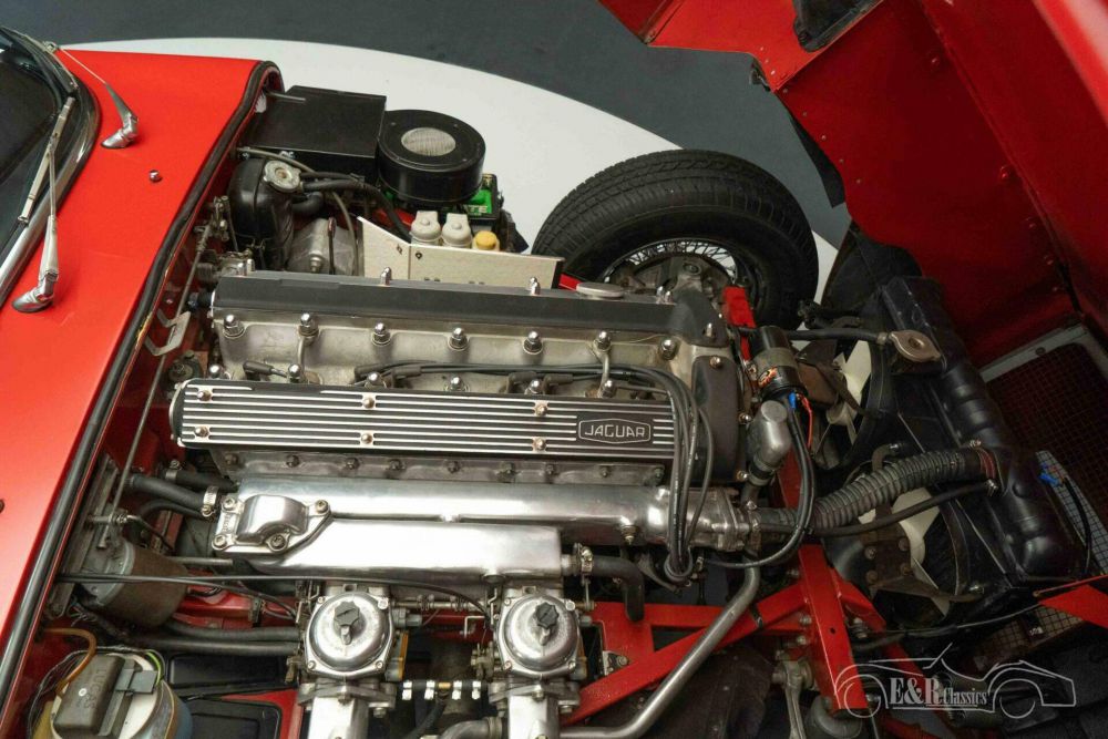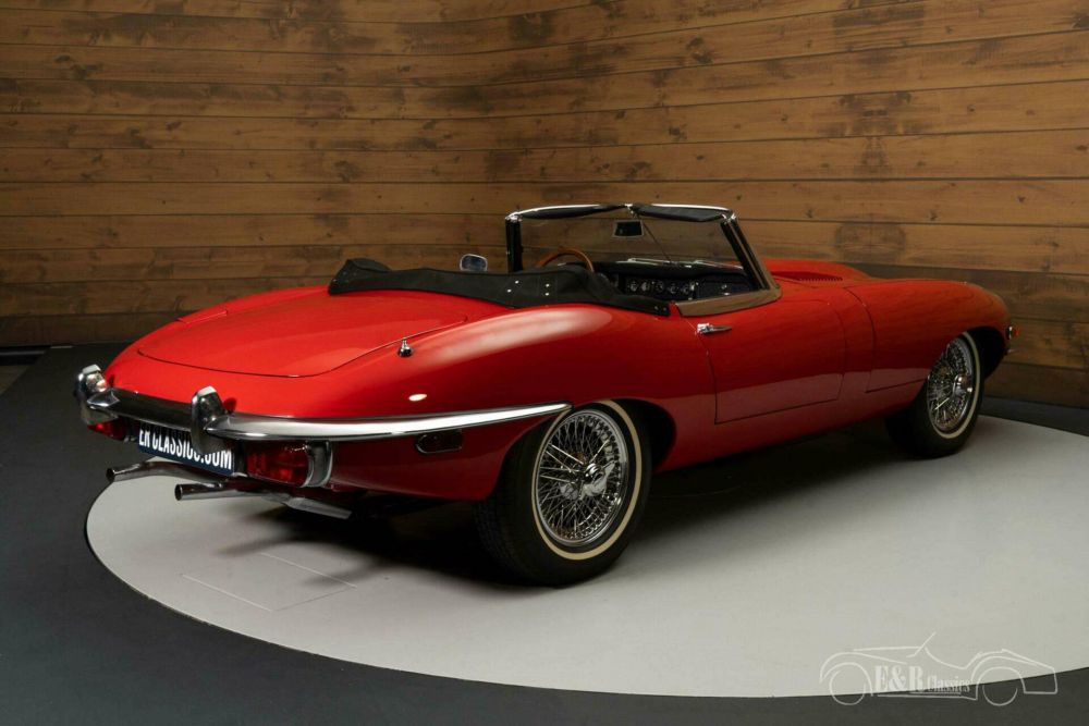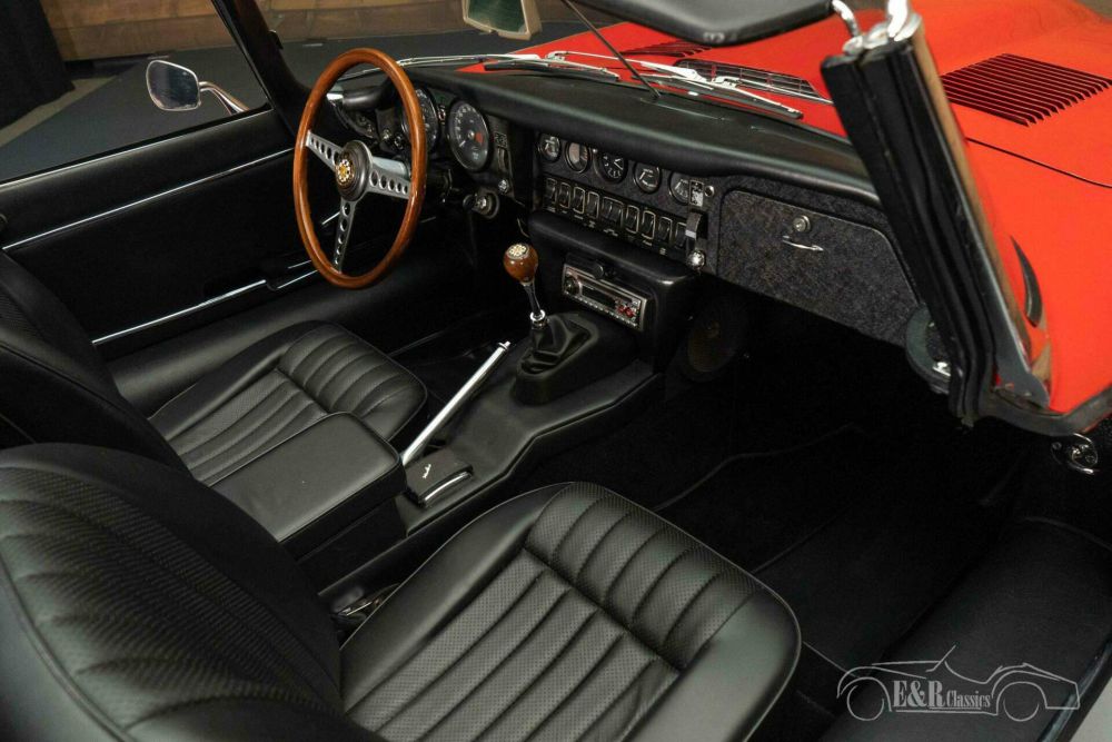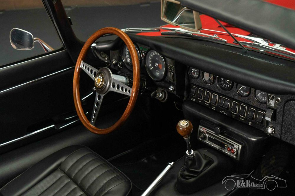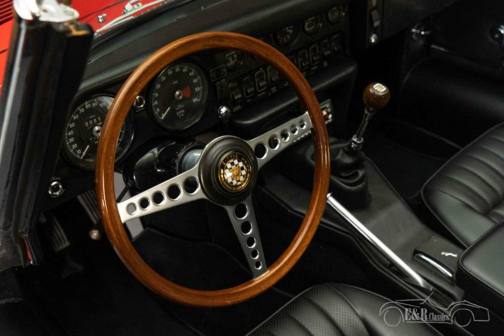 The E-Type that we offer for sale here is truly a sight to behold. It has been restored to the original specifications as the car left the factory in 1969. The Jaguar is finished in the beautiful factory colour Signal Red. A red paint that fits perfectly with a 60s classic and combines very nicely with the chrome. The interior is in very good condition and is equipped with black leather upholstery and a wooden sports steering wheel. The E-Type is equipped with a black soft top that you can fold in an instant when the sun shines.