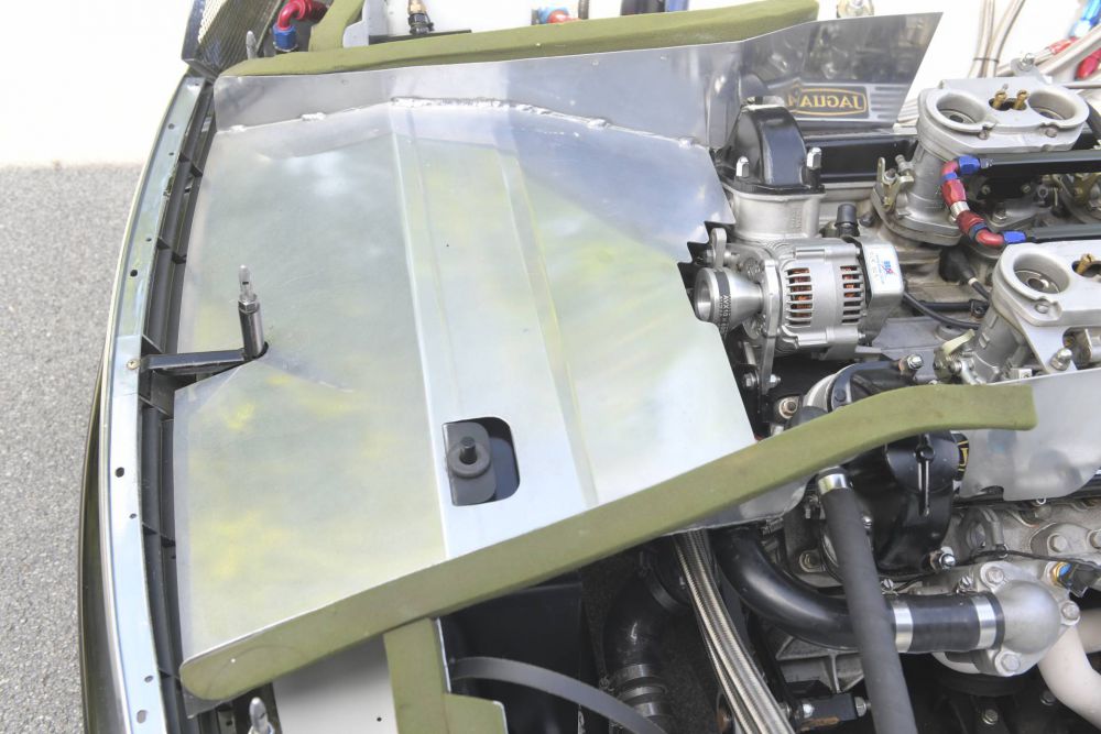 This car, chassis 001 is the first XJS ever built by Tullius’ Group 44 Jaguar Team – constructed in June 1976 using a new body shell supplied by Jaguar Cars in England. The main responsibility for developing this car belonged to Brian Fuerstenau, Group 44's engineer and Latton 'Lanky' Fouchee the team's chief mechanic. ‘Tube frame’ cars were not introduced to the Trans Am rule book until 1980, so the process began with the bare metal and completely stripped factory-supplied shell. Next, the roll cage was installed with the team ensuring that it was positioned to stiffen the chassis. The suspension went through the usual creative racing modifications. To eliminate bump steer, the steering arms were bent to shorten the distance between them and the steering rack. The power steering was retained but a larger pulley was installed on the pump to compensate for the higher revving engine. Any rubber used in the suspension was replaced with solid joints. The car was also equipped with enormously heavier springs and thick roll-bars. There were also modifications made to front and rear suspension arms to improve strength and increase tire clearance. Braking came from the best that Lockheed could Supply in 1976 – huge discs and 8-piston calipers on the front. The rear used the front calipers from an E-type and Girling discs.
