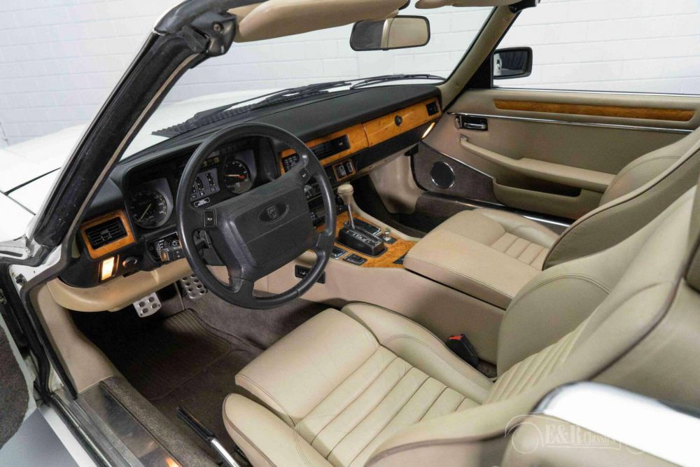 Het gaat hier om een gelimiteerde ‘Classic Collection’ XJS die is uitgevoerd met de kenmerkende honinggraat velgen, dubbele koplampen, classic badges en verguld logo op de motorkap. Hij is uitgevoerd in een wit lakwerk dat helemaal past bij een Engelse klassieker en erg mooi combineert met het lichtbruine interieur. Het interieur verkeert in een zeer nette staat en is uitgerust met lederen bekleding, elektrisch verstelbare en verwarmbare stoelen en een prachtig dashboard met Elm Burl houten afwerking. De XJS heeft een elektrisch verstelbare zwarte soft top die u met een druk op de knop inklapt zodra het zonnetje schijnt.