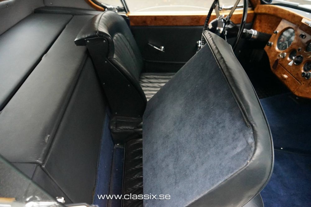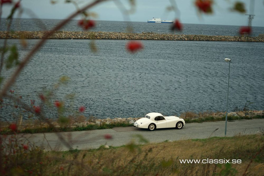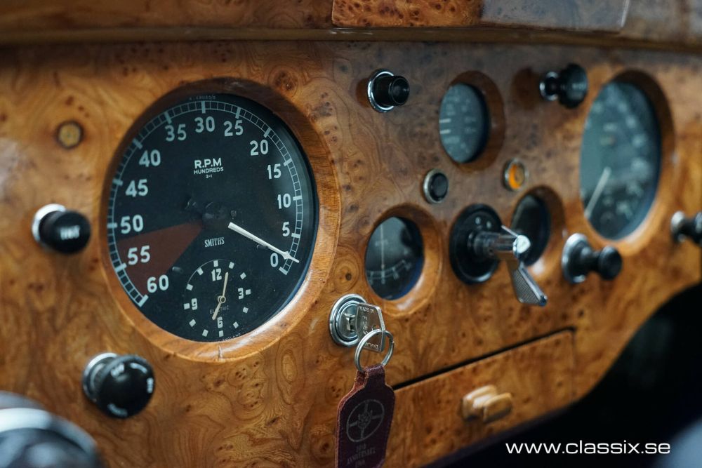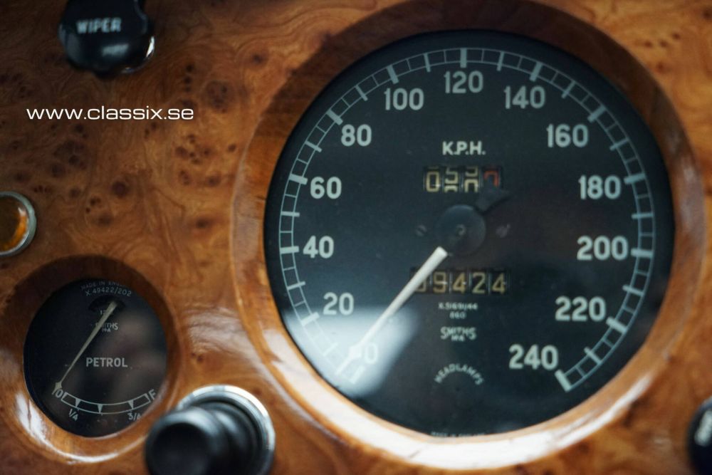 Interior: Inside the XK120 FHC, we find dark blue leather and carpeting in the same color. All the beautiful wood panels in the car are new. The instruments have been revised, and once you’re seated behind the large steering wheel, you’ll feel ready for a long, comfortable drive. The 1954 Jaguar features a clever design, with a small flap on the side of the car allowing cool air inside. When you also open the small screens at the back, the air flows through the car, keeping you cool even on hot days.