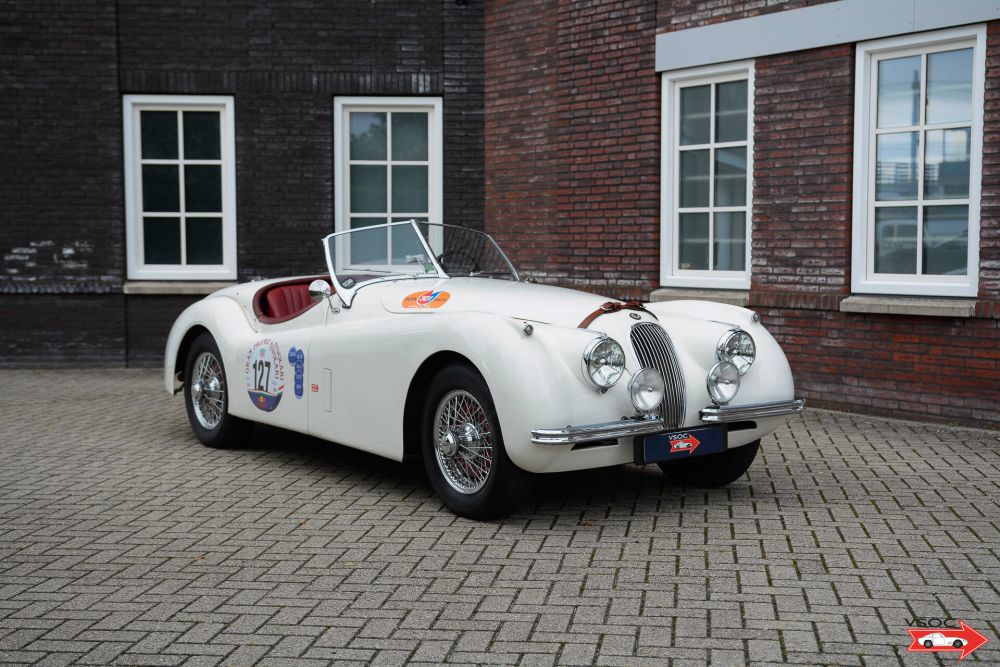 This XK120 benefits from adjustable seats while the original seat parts are with the car. Very suitable for long drivers – 190 cm length without any problems. Furthermore the car comes with chrome wire-wheels, an extra cooling fan, fog lights, aluminium radiator, Halda tripmaster, side windows, tonneau cover and a black convertible roof. The dedicated owner spent approximately 20.000 Euro maintaining the car to a high standard over the last 12 years. The bodywork shows it has had a specialist high quality restoration and also the paintwork shows very well. The body is straight and panel fit is excellent. The engine starts on the button and shows a healthy oil pressure. The Moss gearbox is not the fastest but is a delight to use. The interior is in great condition and only has some wear on the foot carpets – the leather seats are in lovely condition. The result is a superb and fast XK120 ‘SE’ Roadster in very well prepared condition!