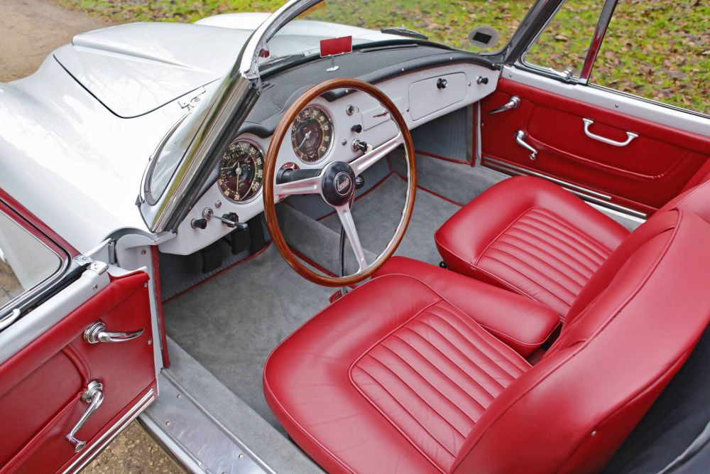 This particular B24S was originally assembled in May 1957 and is a matching numbers car with Chassis n° B24S-1350 mated with Engine n° B24-1463. It has had a full restoration which ended in 2013. The restorer chose for a more conservative paintwork in ‘Grigio’ colour (light grey), but contrasted with the desirable dark red, leather interior. Original hardtop is also included !