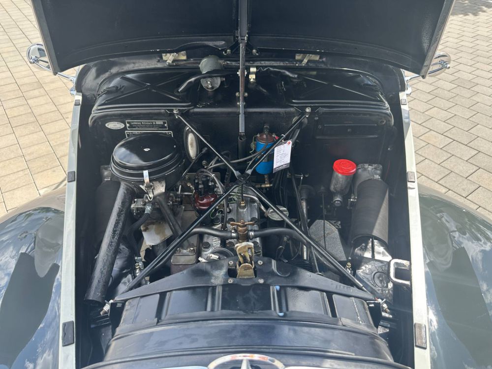 Dieses wunderbare Mercedes-Benz 170 S Cabriolet A in der Farbe graphitgrau / hellgrau mit grauem Verdeck und rotem Lederinterieur wurde am 04.12.1950 erstzugelassen. Der Klassiker ist in einem schönen, gepflegten Zustand und im Jahre 2002 komplett restauriert. Hierzu gehört alle technischen Umfänge, Karosserie, Lackierung und auch ein komplett neuer Kabelbaum. Das Fahrzeug ist in einem technisch einwandfreien Zustand und wird mit einem neuen Kundendienst, neuen MICHELIN Reifen und Hauptuntersuchung ausgeliefert. Zur Ausstattung dieses Klassikers gehören unter anderem ein 3-Speichen Aluminium-Lenkrad mit Kunststoffkranz in hellelfenbein, ein Radio, Bosch Scheinwerfer und Nebelscheinwerfer und Winker. Neben einem alten Fahrzeugbrief liegt zudem ein Wertgutachten mit der Note 1-2 vor.