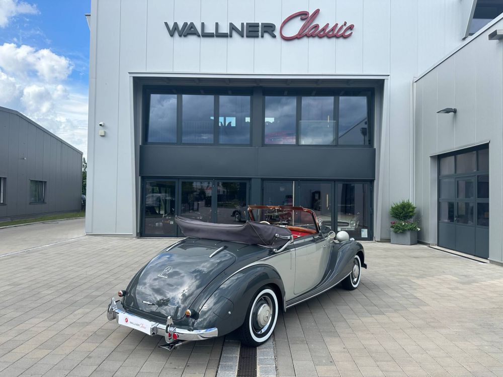This wonderful Mercedes-Benz 170 S Cabriolet A in the color graphite grey / light grey with grey soft top and red leather interior was first registered on 04.12.1950. The classic car is in a beautiful, well-kept condition and was completely restored in 2002. This includes all technical features, bodywork, paintwork and a completely new wiring harness. The vehicle is in wonderful technical condition and is delivered with a new customer service, new MICHELIN tires and a general inspection. The equipment of this classic car includes a 3-spoke aluminum steering wheel with plastic rim in light ivory, a radio, Bosch headlights and fog lights and indicators. In addition to an old vehicle registration document, a valuation report with a grade of 1-2 is also available.