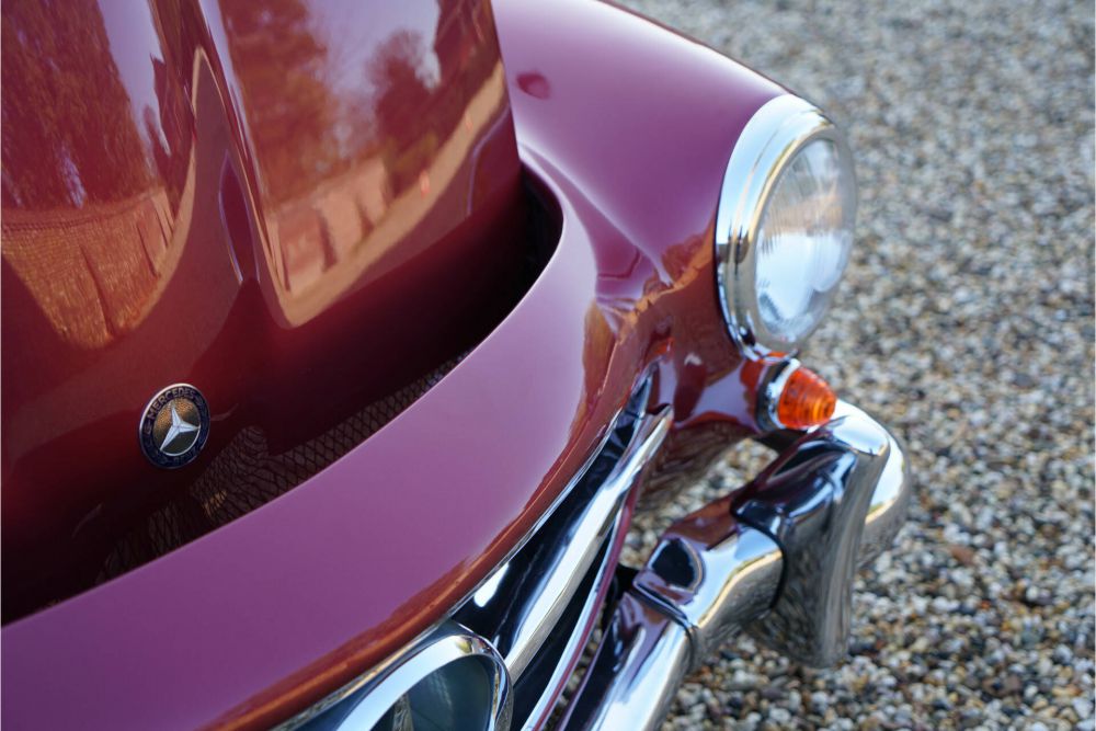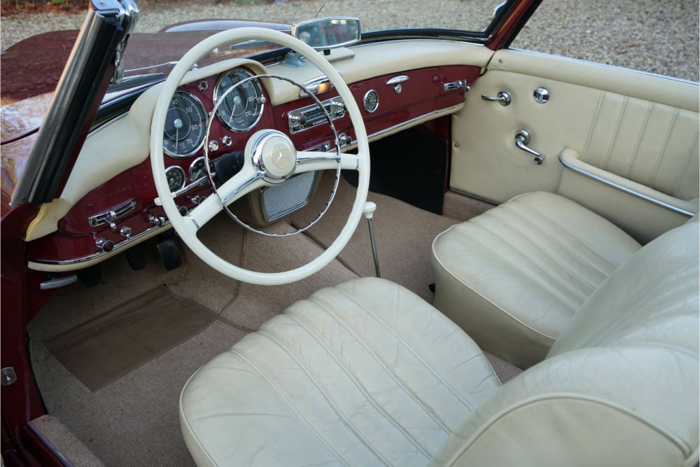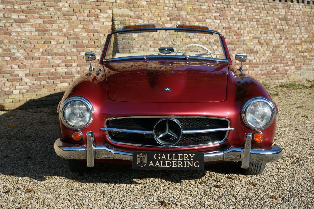 Isn't she a beauty? The Mercedes-Benz 190 SL is a feast for the eyes in any version and colour scheme. However, in this colour scheme, it is an exquisite car of extraordinary class. The 'almandine red' exterior is complemented by a cream-colored interior, giving this 190 SL a fresh appearance even 62 years after its first registration. The car has been registered with Dutch license plates since 2000 and was extensively overhauled and restored in recent years. The work was carried out by a renowned Mercedes-Benz specialist and was thoroughly documented. You can immediately see all this effort it in the car's appearance. The red paint is in excellent condition and was very well applied during the restoration. The bodywork is in top condition with beautifully sheet metal and correct alignment. The chrome and hubcaps are exactly as they should be and look stunning. The interior was reupholstered once and looks magnificent. The carpets are in a beautiful light brown color, forming a stunning compliment together with the beige leather. The high-quality execution of the upholstery work is immediately noticeable at first glance. The leather has aged nicely and developed a beautiful patina. The rest of the interior is equally exquisite. The controls and instruments all look impeccable and function perfectly. The technology is also flawless. When you open the engine compartment, it feels like you're taking a trip back to 1962 when the car was new. The ignition, the pipes, the engine block, everything looks like the car just rolled off the assembly line. It will come as no surprise that driving this 190 SL is an absolute joy. While this 190 SL may be approaching retirement age, it is fitter than many in their thirties. The engine runs perfectly, the clutch and gearbox are smooth to operate, adding to the driving pleasure. The suspension of the 190 SL is perfectly sprung and damped thanks to the frequent use of new parts and greatly contributes to its modern driving behavior. In short, a fantastic Mercedes-Benz 190 SL in beautifully restored and revised condition.
