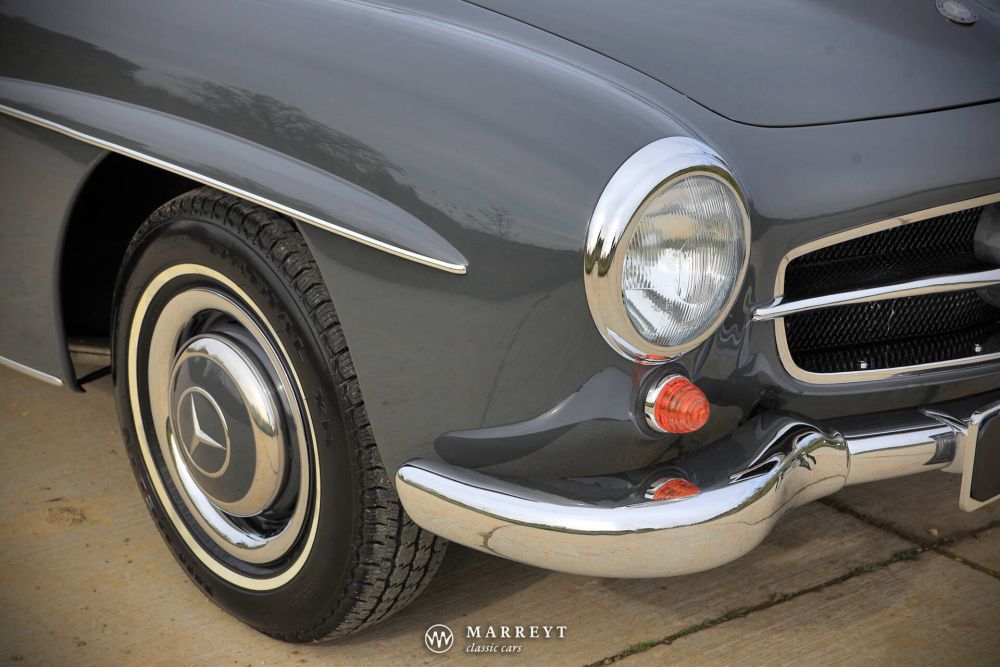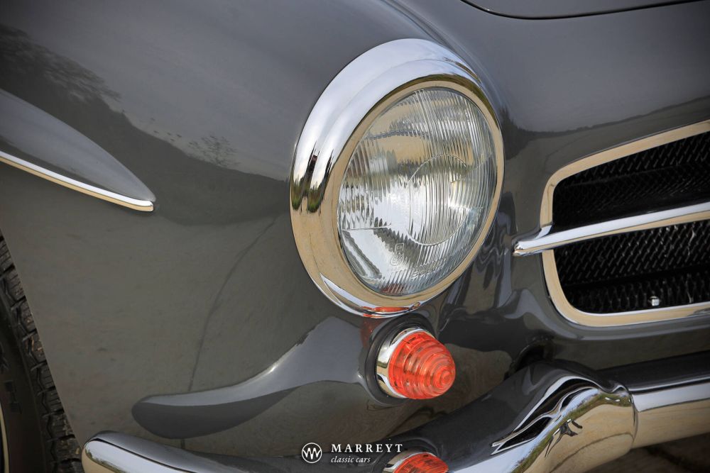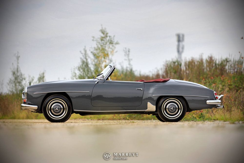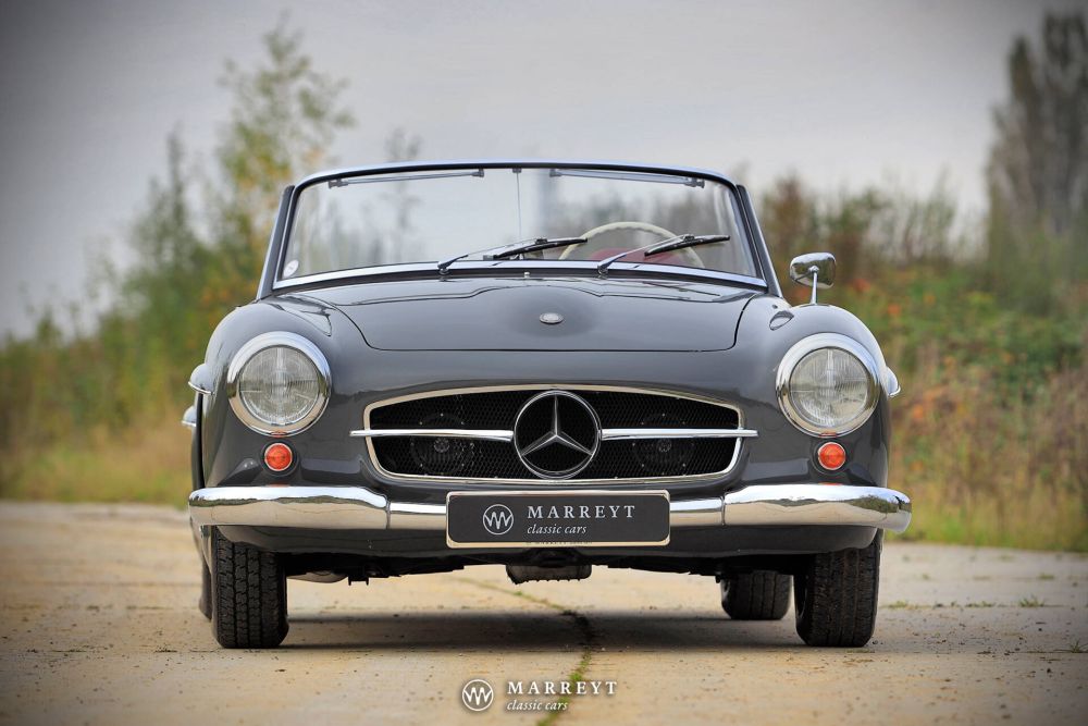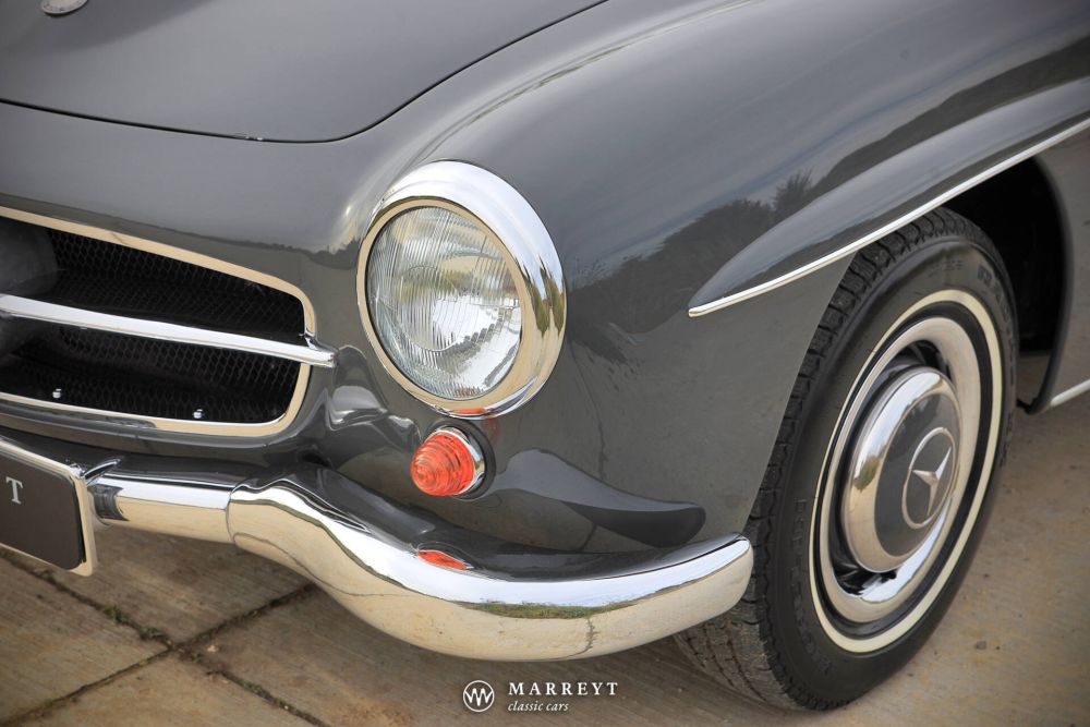 We are pleased to offer you this 1958 Mercedes 190SL Roadster.  Like many of its kind, the car was produced for the American market, where the SL was  very popular. 10 years ago the car came over to Belgium. A a full restoration was started  between 2016-2020. It was finished in stylish “Graphite Grey” combined with a red leather interior. A red mohair convertible roof complete its timeless elegance. However this combination is not the original one for this car, we couldn't imagine a better match.