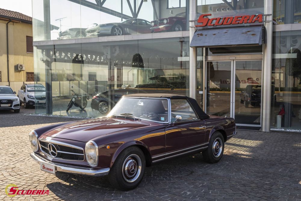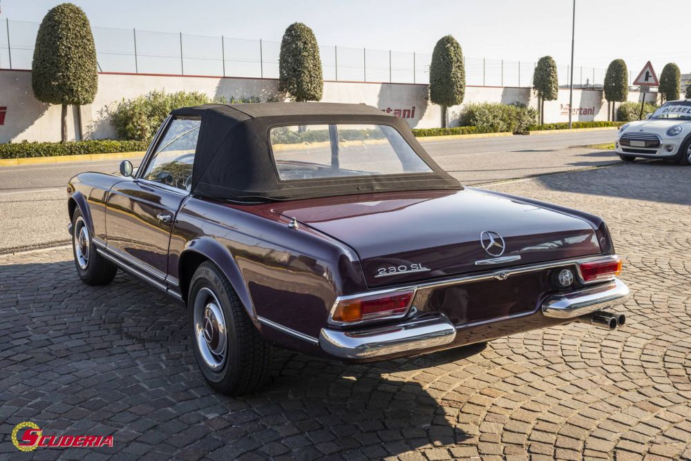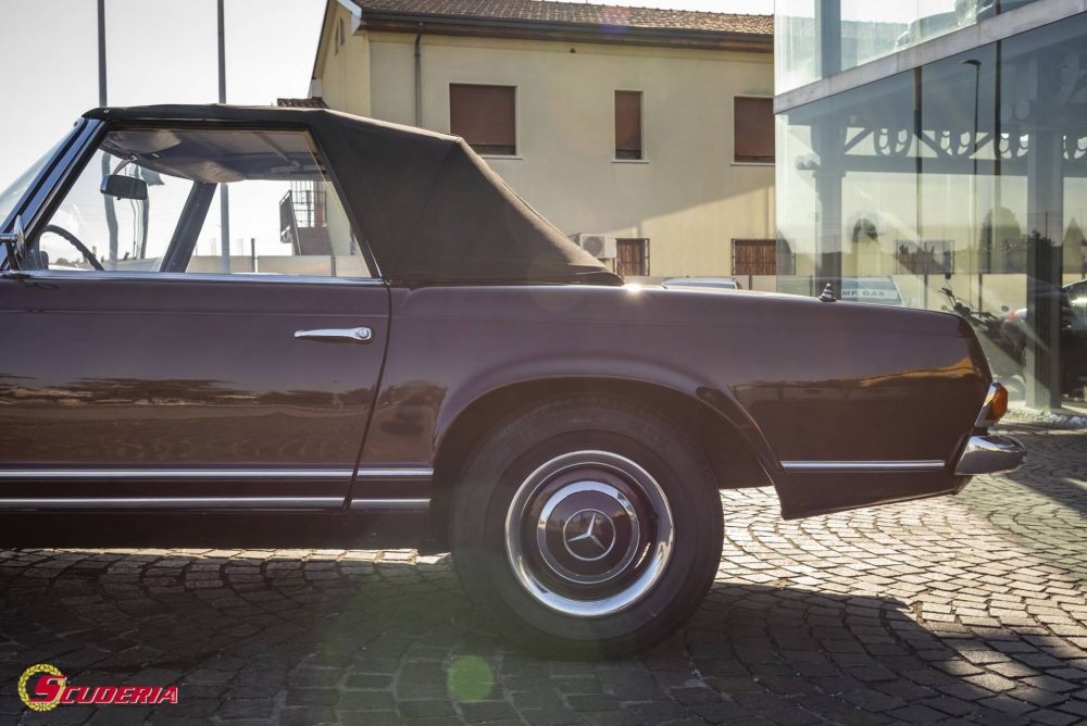 Mercedes-Benz 230 SL Pagoda Di colore Amaranto con interni in pelle nera.