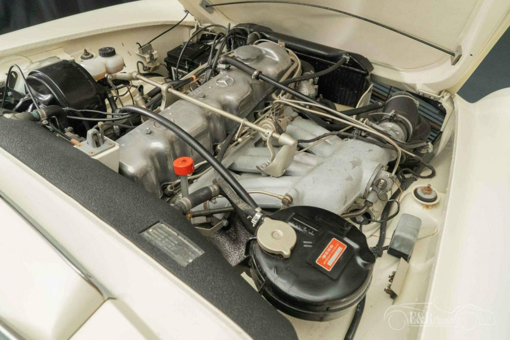 The Mercedes-Benz 230 SL that we offer for sale here has a very stylish appearance. It has a beautiful cream-coloured white paint that combines very nicely with the chrome. The red interior pops and contrasts very nicely with the white paint. The interplay between the paint and the interior makes it a real eye-catcher. The Pagode is supplied with a hard top and a beige soft top.