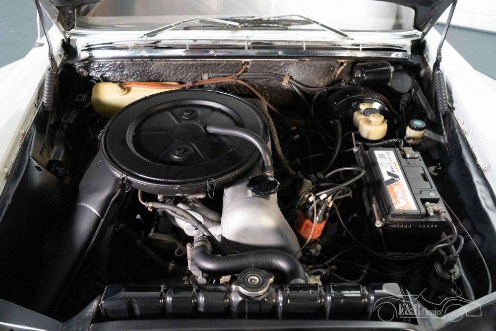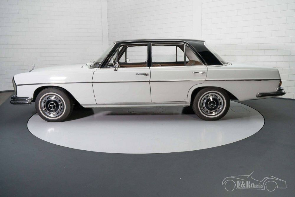 This Mercedes-Benz 250 S is an imposing appearance. Its huge grille, double headlights and chrome bumpers are the first things that strike you when you see this classic. It is finished in white paint with a black roof, which makes for a very tasteful colour combination. The brown interior stands out nicely against the white paint and makes the appearance complete.