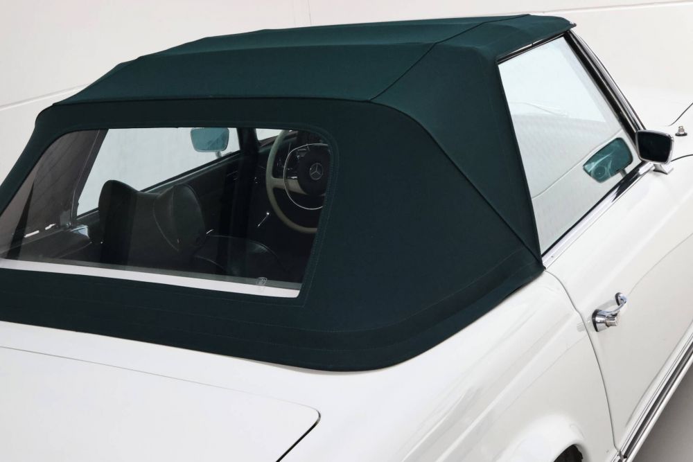 This Pagoda’s manufacturer completion date was 29 November 1968, with a dealer code of 706 indicating original USA delivery. It is presented in its original factory-delivered colour scheme of Papyrus White exterior paintwork, complemented by Dark Olive hard and soft tops. The contrasting white and dark green is quite unusual, but very striking, providing an appealing visual appearance.