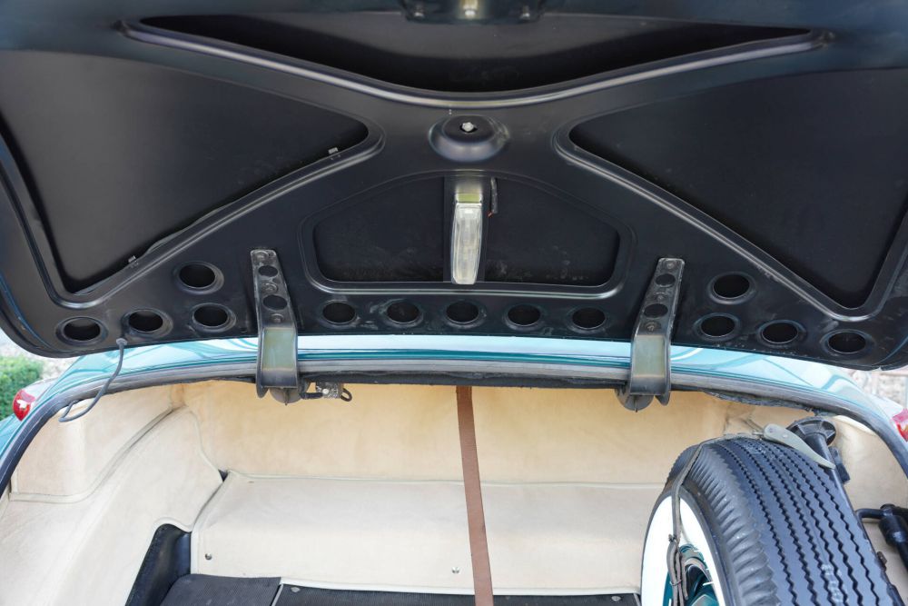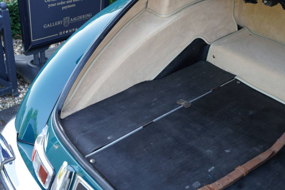 Inside, we find beautiful green leather upholstery. Everything is very well-maintained and original. The leather upholstery has been recently reupholstered, as have the carpets, and both the instrument panel and the beautiful steering wheel are very neat and authentic.