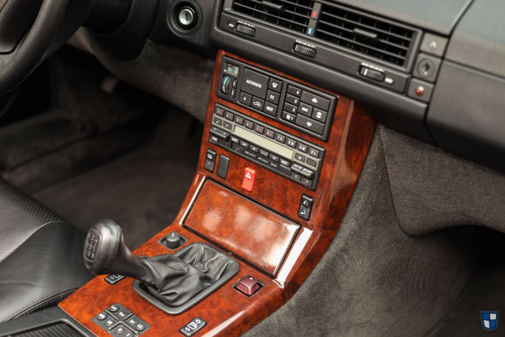 The leather is very supple and deep black. Steering wheel and gear lever in lovely soft and original leather. The woodtrim in high-gloss. Behind the black lid is the great 90's option, the onboard computer or 'Reiserechner' in German.