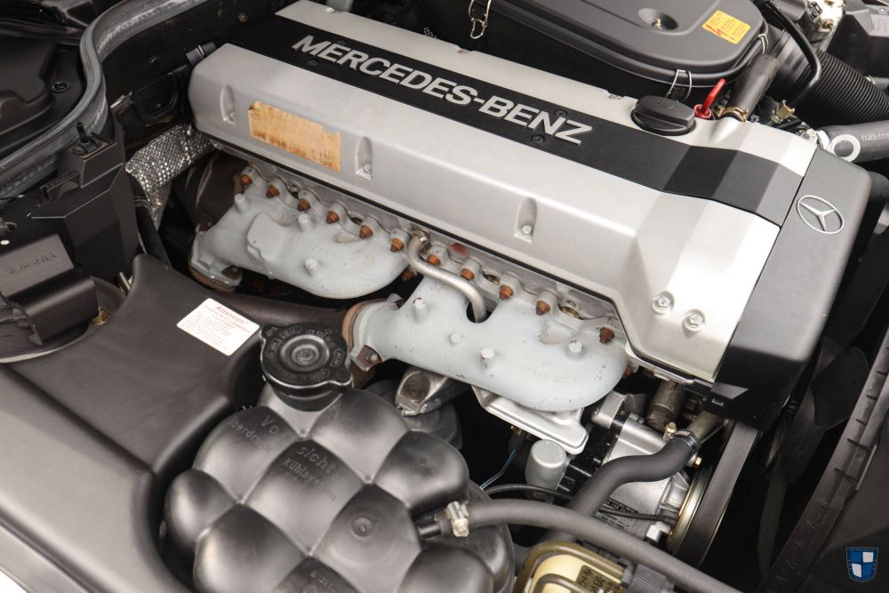 As with very low-mileage Benzes of these age - the exhaust manifolds on this 3 liter M104 engine are still in their grey coating and didn't burn off. The engine bay show all original decals, clamps and (chalk) marks. The bumpers don't have any scuffs and all trim and high-gloss black parts are in amazing original condition.