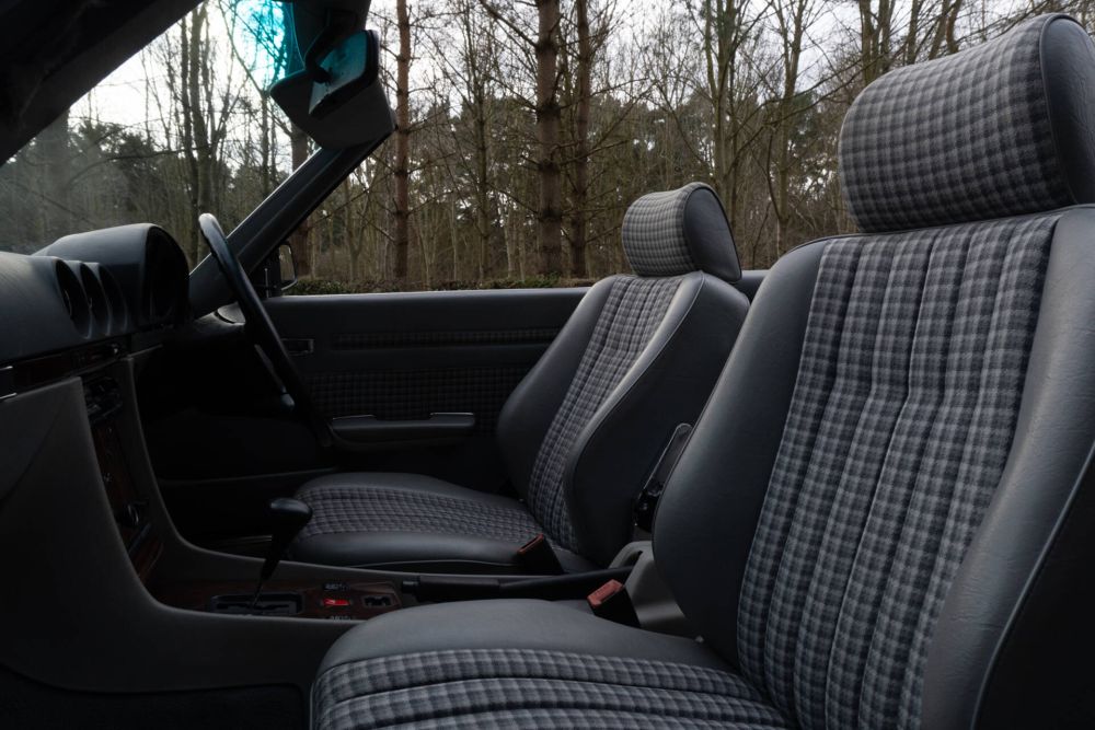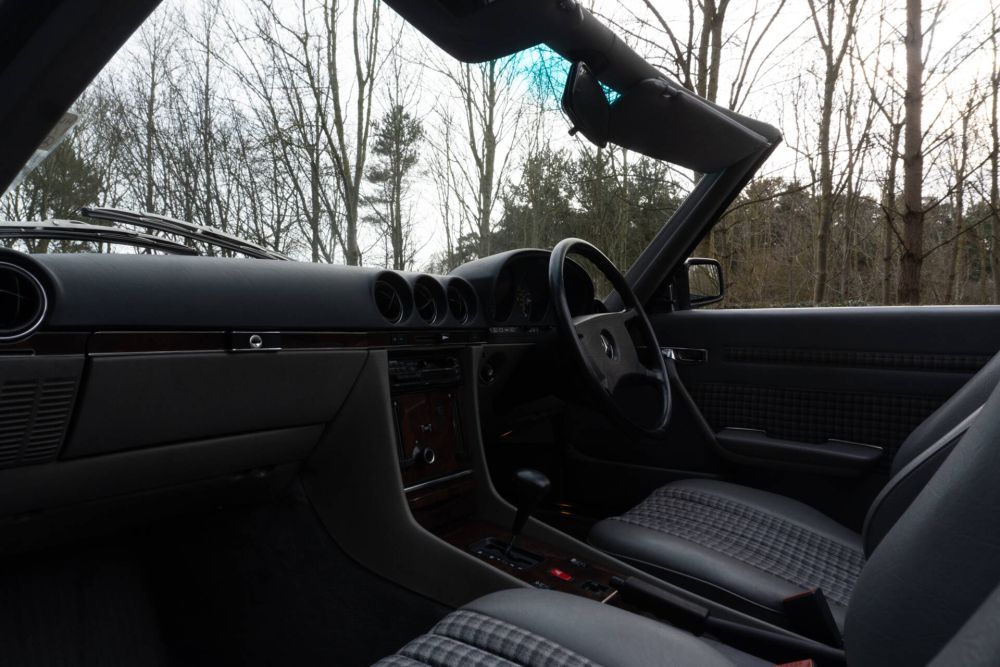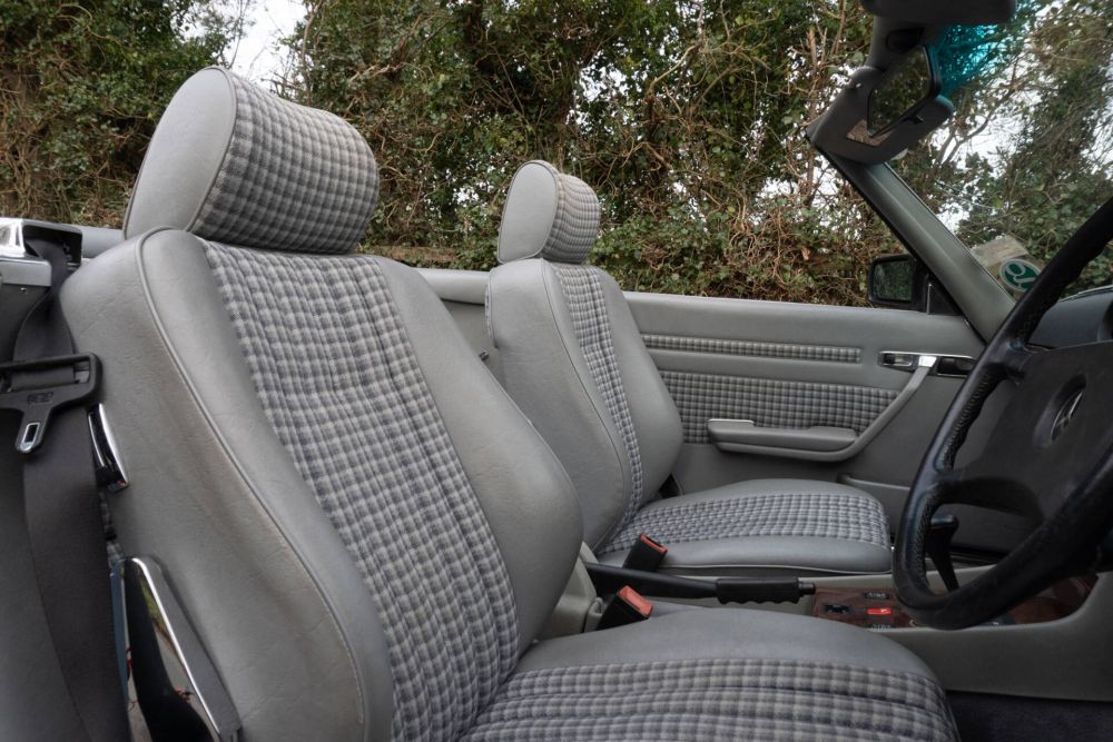 From 2004 and now in the hands of our long term friends, the SL was to be looked after by specialists Merc-Care in Pudsey, Leeds. Services and maintenance are recorded at 35254, 38883, 42759, 44904, 45962, 47793, 49505, 50444, 51109, 52421 53347, 54342 and 59709 miles with absolute no expense spared throughout ownership. In 2021 over £10,000 was spent on a paint re-fresh in the cars original Pearl Blue, and having been kept garaged most of the cars entire life original brightwork is still in impressive condition, as is the cars original factory hard top. The Grey cloth upholstery is beautifully presented and original, and the car also has the optional rear seat option. E333 TEC has an excellent Dark Blue mohair hood and alloy wheels are presented in lovely condition.