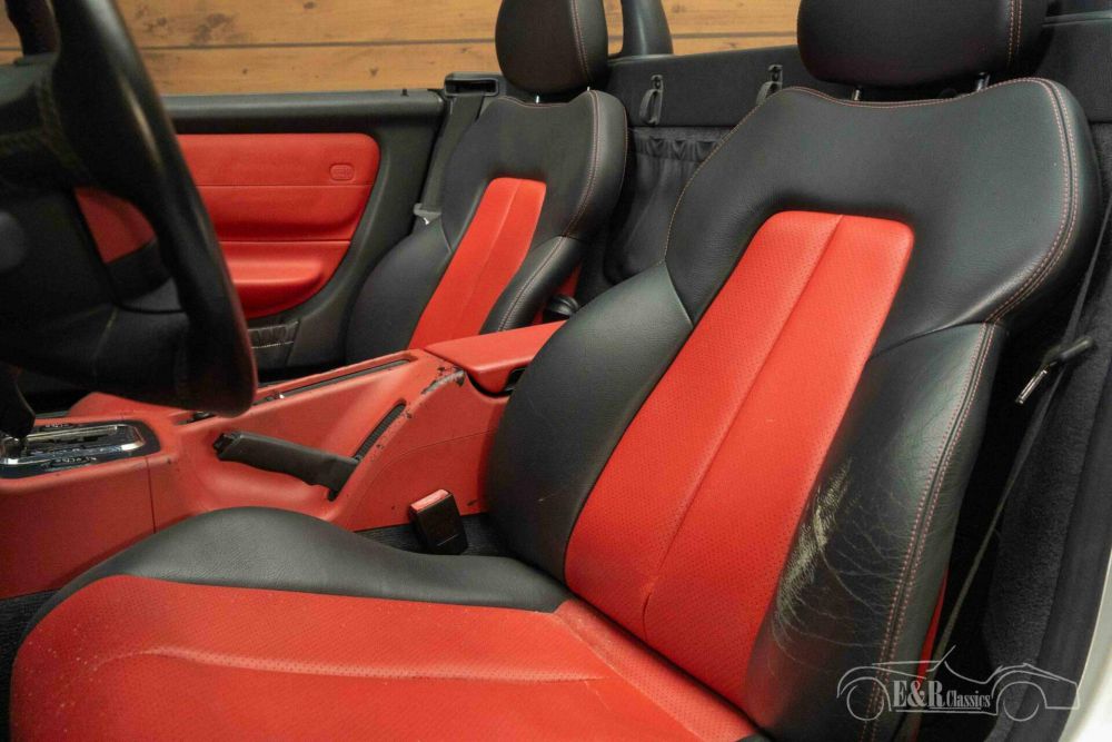 The Mercedes-Benz SLK 230 that we offer for sale here has a beautiful silver-grey metallic paint and sits on a set of original 16 alloy wheels. The interior contrasts beautifully with the paintwork and has red/black leather upholstery and various options such as cruise control, air conditioning and electrically operated windows. As soon as the sun shines, you can fold the electrically operated cabrio roof at the touch of a button so that you can enjoy the fresh air while driving.