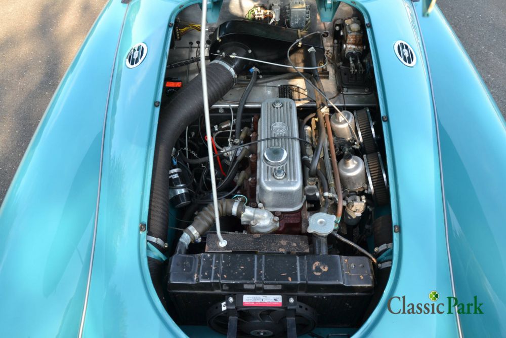 The name MGA was chosen because this car was to introduce a new line of sports cars. The car also featured the new BMC B-series engine which allowed for a lower bonnet. The MGA convertible was also fitted without exterior door handles for aerodynamics and lighter weight. The BMC B-series engine was initially a 1489cc 4-cylinder unit with 2 SU H4 carburettors which initially produced 68 and later 72bhp. Mated to a 4-speed manual gearbox the car could accelerate from 0-97 km/h (0-60 mph) in 16 seconds with a top speed of 158 kilometres per hour. At the time the MGA cost £844, the equivalent of around €90,000 in today's money.
