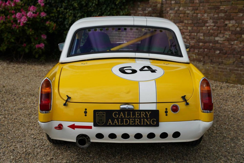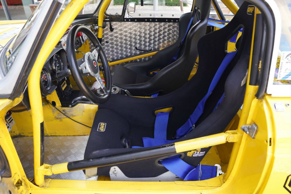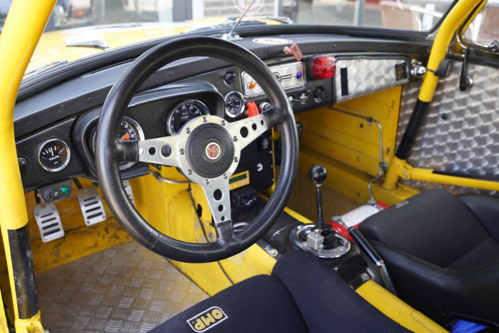 In the same year, the car was converted as a racer for, among others, the MGB Competitions and HARC racing days. This MGB is painted in a yellow solid colour with white accents such as the hard top and spoiler. The engine is a rebored 1800cc to 1950cc 4-cylinder in-line engine with Weber 45 DCOE carburettor, a racing camshaft, stage 1 cylinder head, polished intake ports and a lightweight crankshaft and flywheel, a racing starter motor and aluminium radiator and now produces approximately 135 hp, which is linked to a manual 4 close ratio gearbox. A limited-slip differential was also added. And the cylinder head was recently overhauled. To complete the MGB, Cibie spotlights and a roll bar with a certificate were installed and the correct bucket seats with 4-point racing belts. Various advertising stickers were placed on the outside. And 14” Minilite rims were mounted. The MG also comes with 5 extra rims with racing tyres and 4 separate racing tyres.