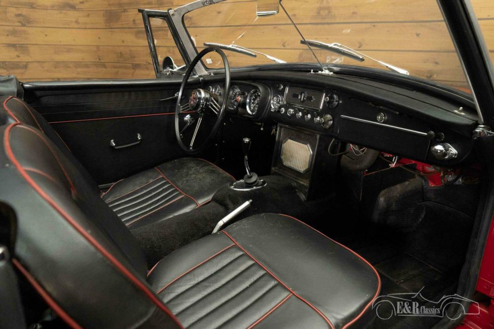 The MGB Cabriolet that we offer for sale here has a nice colour scheme. The red paint fits perfectly with a British Classic from the 1960s and combines beautifully with the chrome and wire wheels. The interior of the MGB has some minor signs of wear and is otherwise in neat, original condition. A black soft top was chosen that you can fold in an instant so that you can enjoy the fresh air while driving.