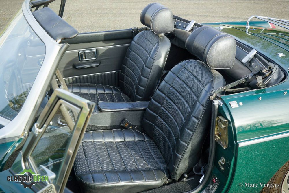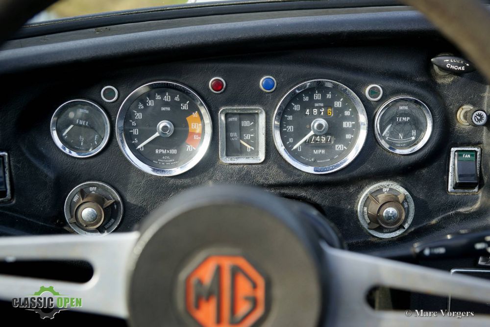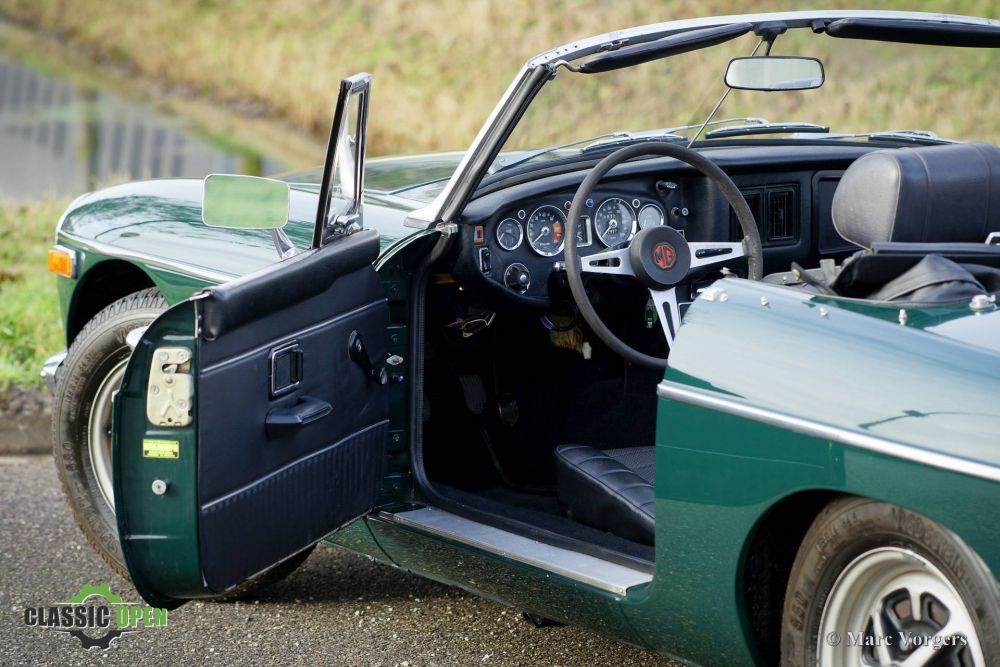 This MGB shows many original details like the Rostyle wheels, the original steering wheel and the side marker lights.