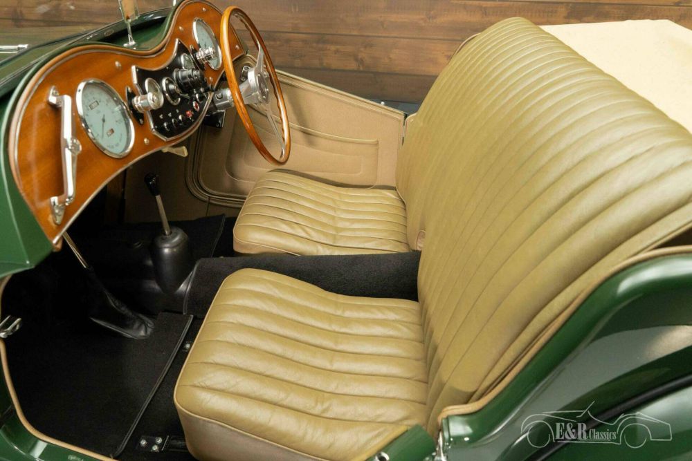 Zoals u op de foto’s kunt zien verkeert deze MG TC in een topstaat. Hij is uitgevoerd in de prachtige kleur British Racing Green die erg mooi combineert met het chroomwerk en de chromen spaakwielen. Het interieur is met leder bekleed en is beigekleurig met een lichte groentint die helemaal past bij het lakwerk. Het houten dashboard, de chromen tellers en het houten sportstuur… het totaalplaatje van deze auto klopt helemaal. Om het geheel af te maken is er gekozen voor een beigekleurige soft top met zijraampjes.