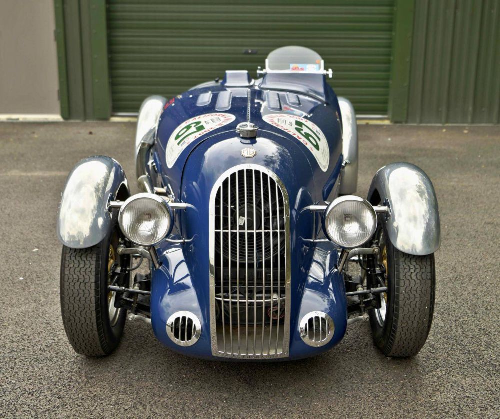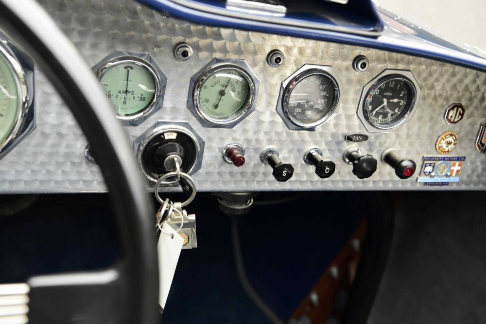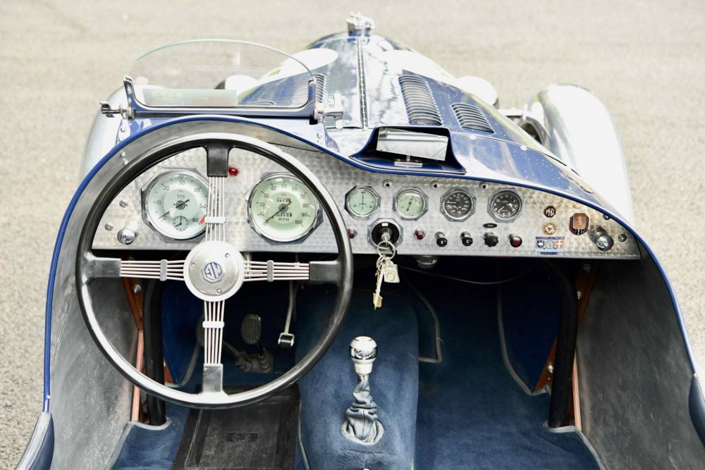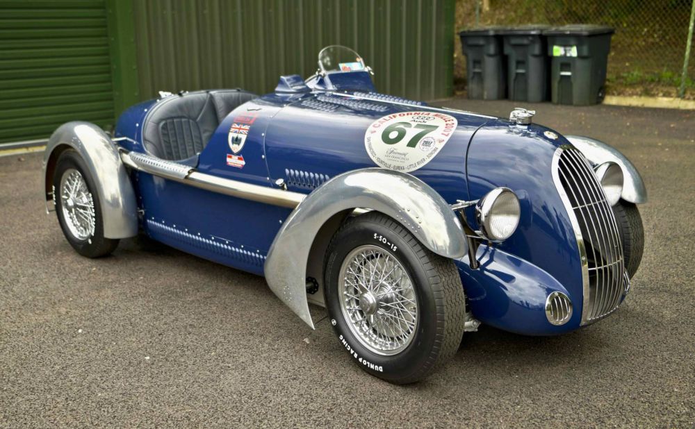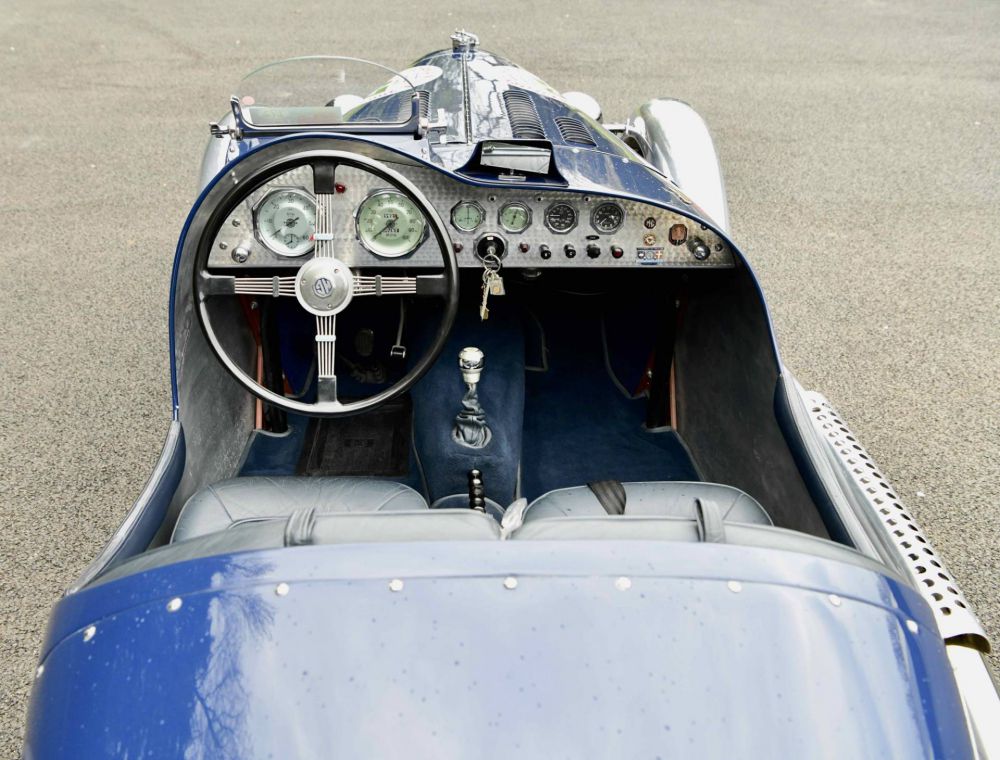 1953 MG TD Supercharged Special Left Hand Drive Chassis Number: TD25816 Just a few hundered miles covered since a no expense build. In brand new condition. A Spectacular, beautifully executed and very stylish MG TD special. Design inspired by Miles Collier’s MG racer “Leonidas,” entered in the 1939 24 Hours of Le Mans. Striking, hand-formed aluminum bodywork with boattail styling. A two-time California Mille participant. Four-cylinder MG engine with period supercharger. Upgraded five-speed manual transmission. Stunning blue paint with polished aluminum cycle fenders. Bluemels Brooklands steering wheel, engine-turned dash with Smiths and Jaeger instrumentation. Fitted with Brooklands windscreen, Marchal headlamps, and racing-style quick-fill fuel cap. Dunlop racing tires on chrome knock-off wire wheels, Alfin drum brakes.