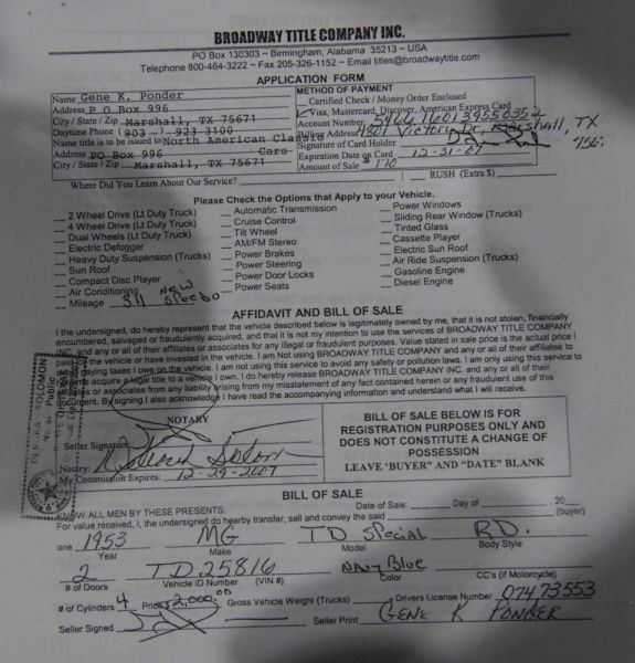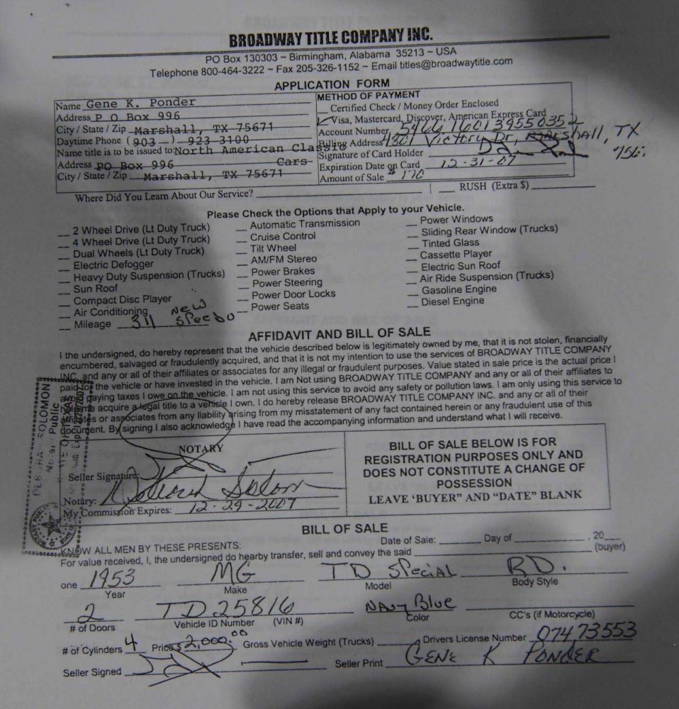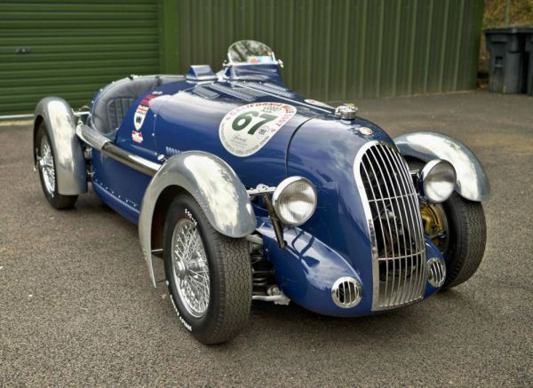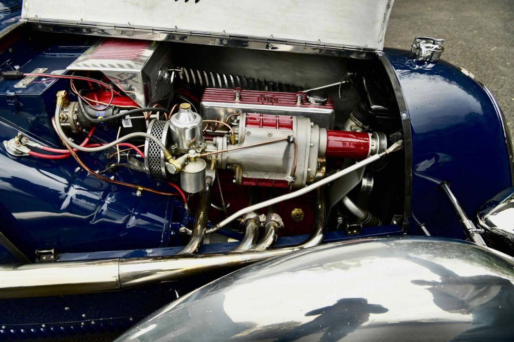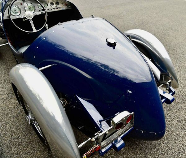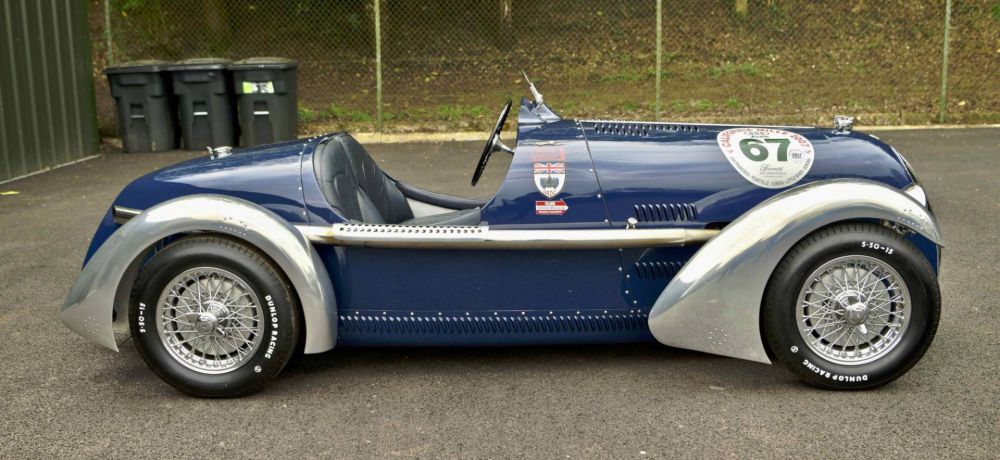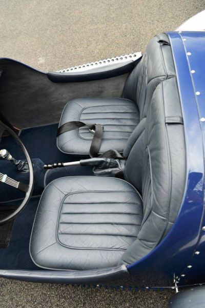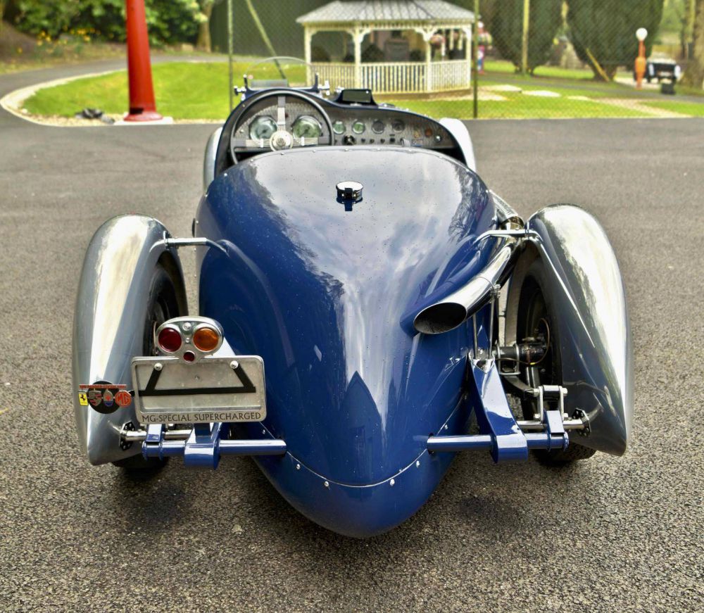 1953 MG TD Supercharged Special Left Hand Drive Chassis Number: TD25816 Just a few hundered miles covered since a no expense build. In brand new condition. A Spectacular, beautifully executed and very stylish MG TD special. Design inspired by Miles Collier’s MG racer “Leonidas,” entered in the 1939 24 Hours of Le Mans. Striking, hand-formed aluminum bodywork with boattail styling. A two-time California Mille participant. Four-cylinder MG engine with period supercharger. Upgraded five-speed manual transmission. Stunning blue paint with polished aluminum cycle fenders. Bluemels Brooklands steering wheel, engine-turned dash with Smiths and Jaeger instrumentation. Fitted with Brooklands windscreen, Marchal headlamps, and racing-style quick-fill fuel cap. Dunlop racing tires on chrome knock-off wire wheels, Alfin drum brakes.