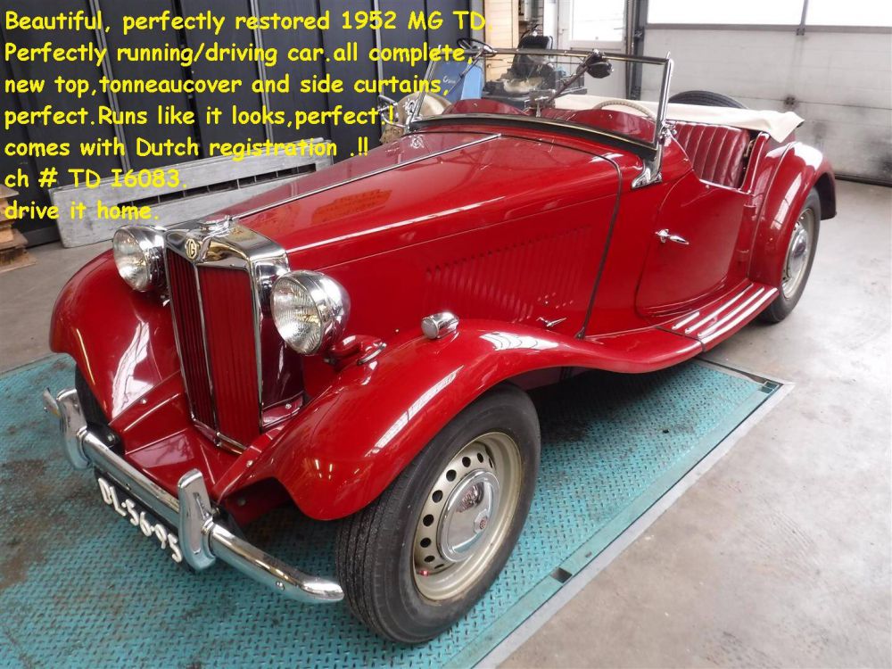 Beautiful, perfectly restored 1952 MG TD.Good running / driving car. All complete,all new top , tonneaucover and side curtains, in very good condition. Runs like it looks ! Comes with Dutch registration. You can drive it home ! Biggest choice in REAL Classic Cars in the Stolze Collection with more than 450 cars in stock ! From a project to perfect .