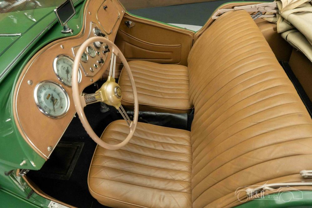 The MG TD that we offer for sale here is exactly what an English classic should look like, finished in the beautiful colour British Racing Green. The colour looks fantastic on the car and combines very nicely with the chrome. The interior is in good condition and is equipped with brown upholstery that combines beautifully with the paint. To top it all off, the MG TD is equipped with a beige-coloured fabric soft top.
