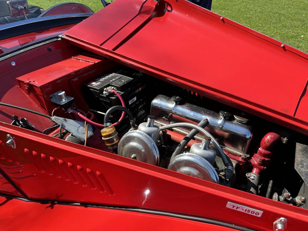 MG TF1500 1955, red with black mohair soft top and tonneau cover. Full black leather interior and black carpets. This lovely restored MG started life in California and has since been restored and converted to right hand drive. The restoration included the following: New Ash frame, body panels stripped and repainted, engine and gearbox rebuild, rear axle overhaul, new interior trim and carpets, new hood and tonneau cover, dynamotor, wiring loom, radiator refurbished, new springs and bushes, new brake lines, wheel cylinders, master cylinder and shoes, new steering rack. Still in lovely condition throughout.
