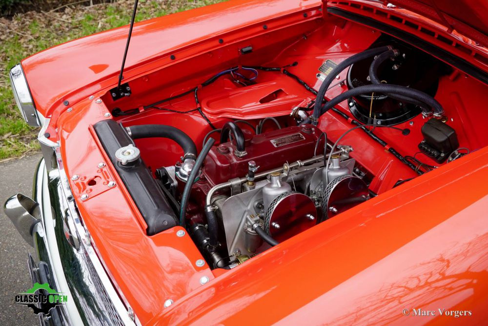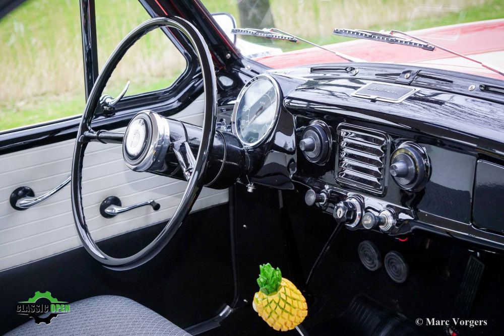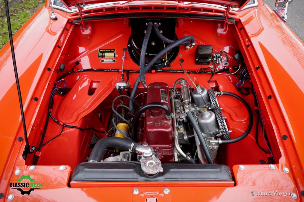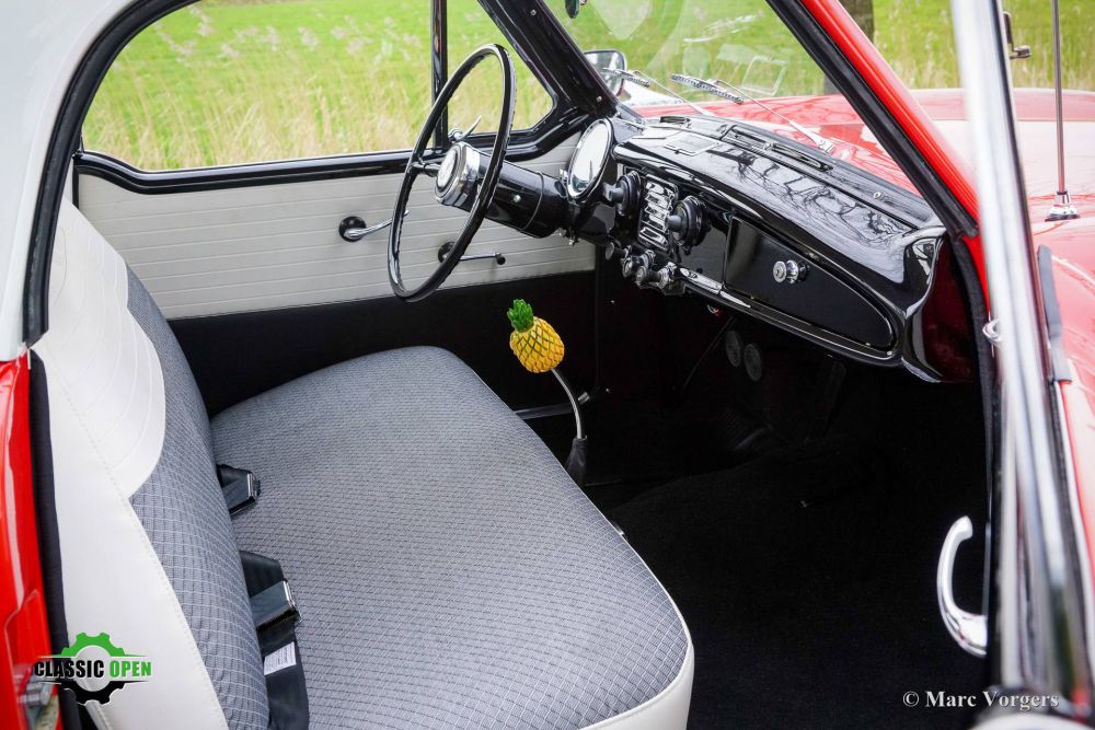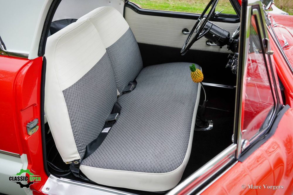Nash Metropolitan from 1959. Original in the colors red and white. White-gray interior entirely according to the original specifications. The black metal dashboard looks perfect with all the original switches and the nice speedometer in the middle in front of the original steering wheel. The Nash is equipped with the well-known 1500 cc MGA engine with 2 SU carburettors. This Metropolitan has been modified on a few points and now has a modern 5-speed gearbox, an alternator and electronic ignition. The front suspension was also modified and is equipped with disc brakes. Partly for this reason, 14 rims were installed instead of the original 13 rims. From 1959 onwards, the Metropolitan has a tailgate and a convex rear window in one piece.