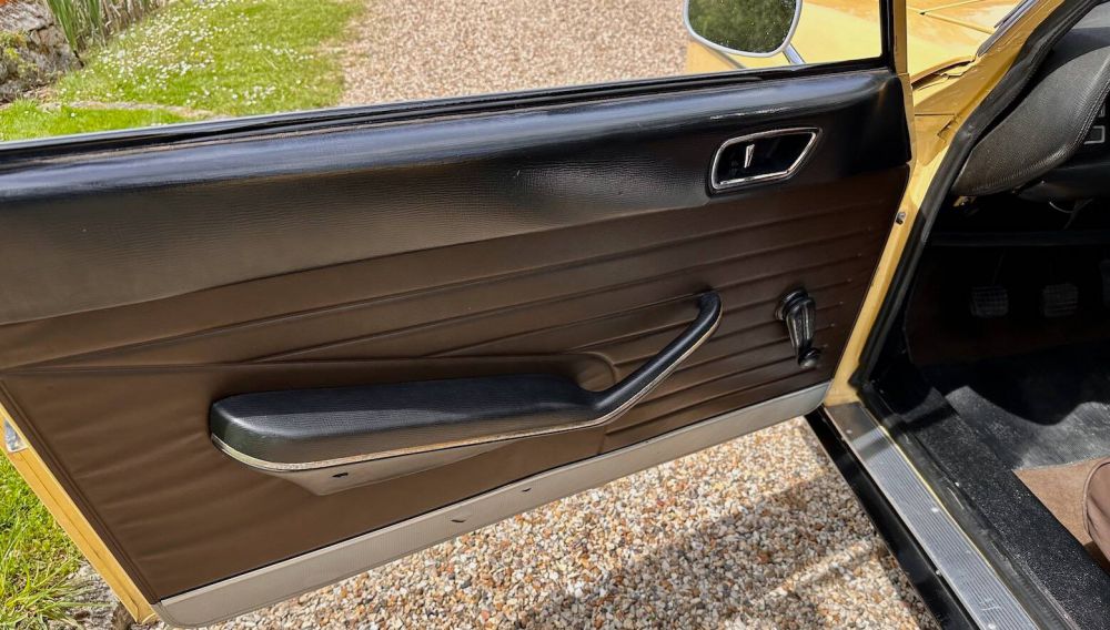 L’intérieur est en parfait état, pas de déchirures sur les sièges, qui sont confortables, le tableau de bord est conforme à l’origine, sans craquements et très vintage. La moquette est propre, les panneaux de porte complet, le ciel de toit également.