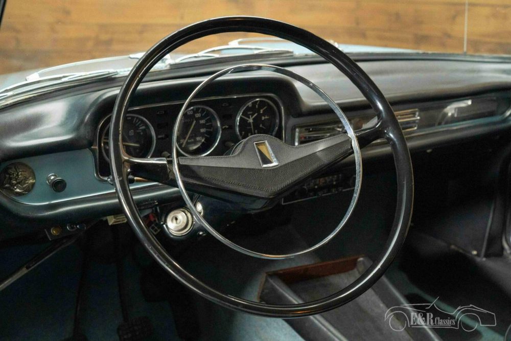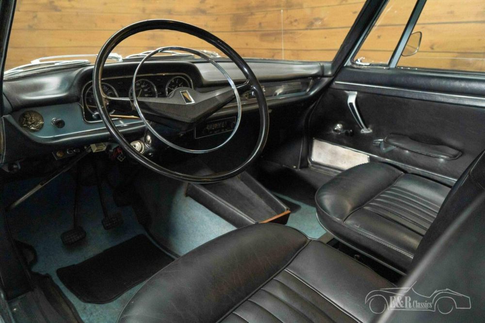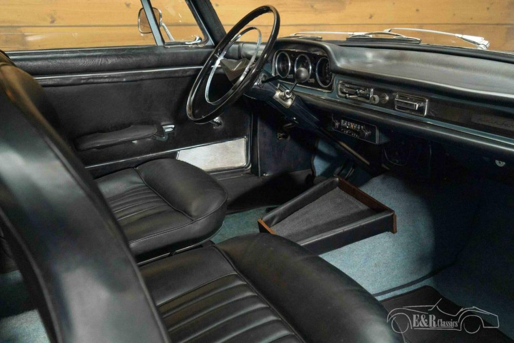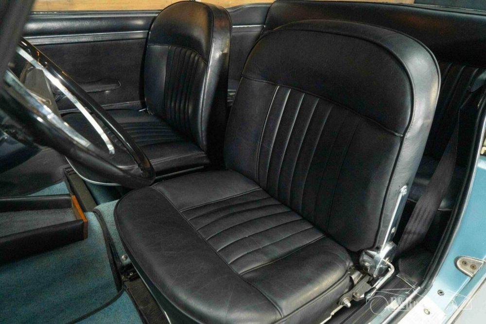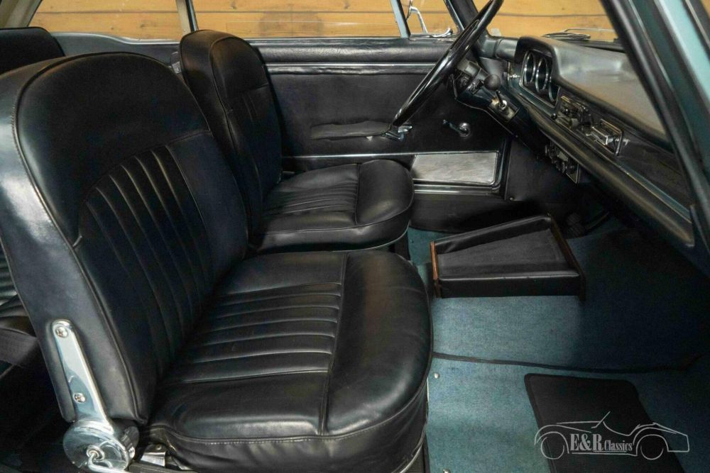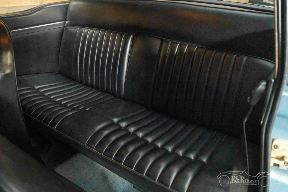 The light blue paintwork of the Peugeot 404 Coupe contrasts beautifully with the black leatherette upholstery, which gives a timeless look. The sleek lines of the bodywork emphasize the refined styling of Pininfarina, while the classic rims complete the authentic look. The interior exudes class, with a beautiful dashboard and comfortable seats that perfectly match the exterior.