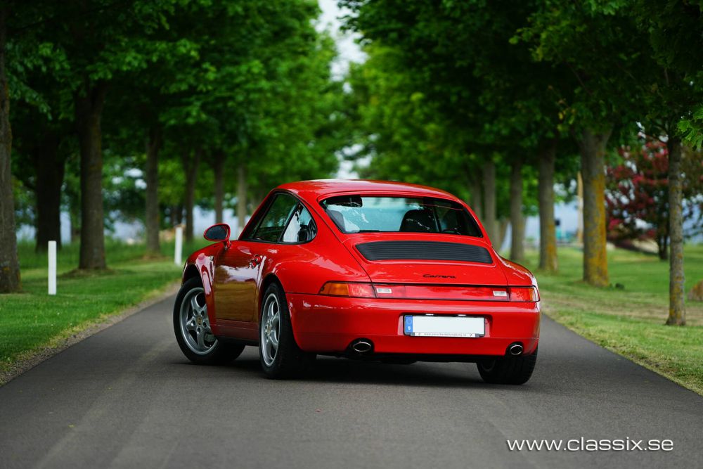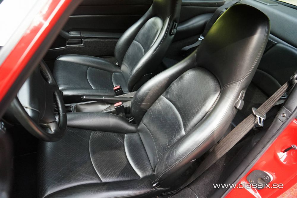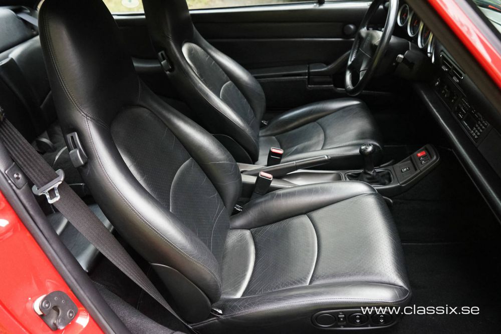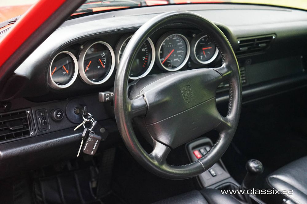 Exterior: This 1994 Porsche 993 Carrera is painted in the striking color Guards Red. The paintwork and body are in exceptional condition, with a nice and shiny finish free of scratches, dents, or stone chips. The body is completely damage-free and has never experienced corrosion. The car sits on 17-inch original cup wheels that have new Michelin cup tires. The pristine condition of the exterior extends to the underside, front trunk, and engine bay, all of which look practically new. This car is a two-time concours prize winner at the Swedish Porsche Club, underscoring its outstanding condition.